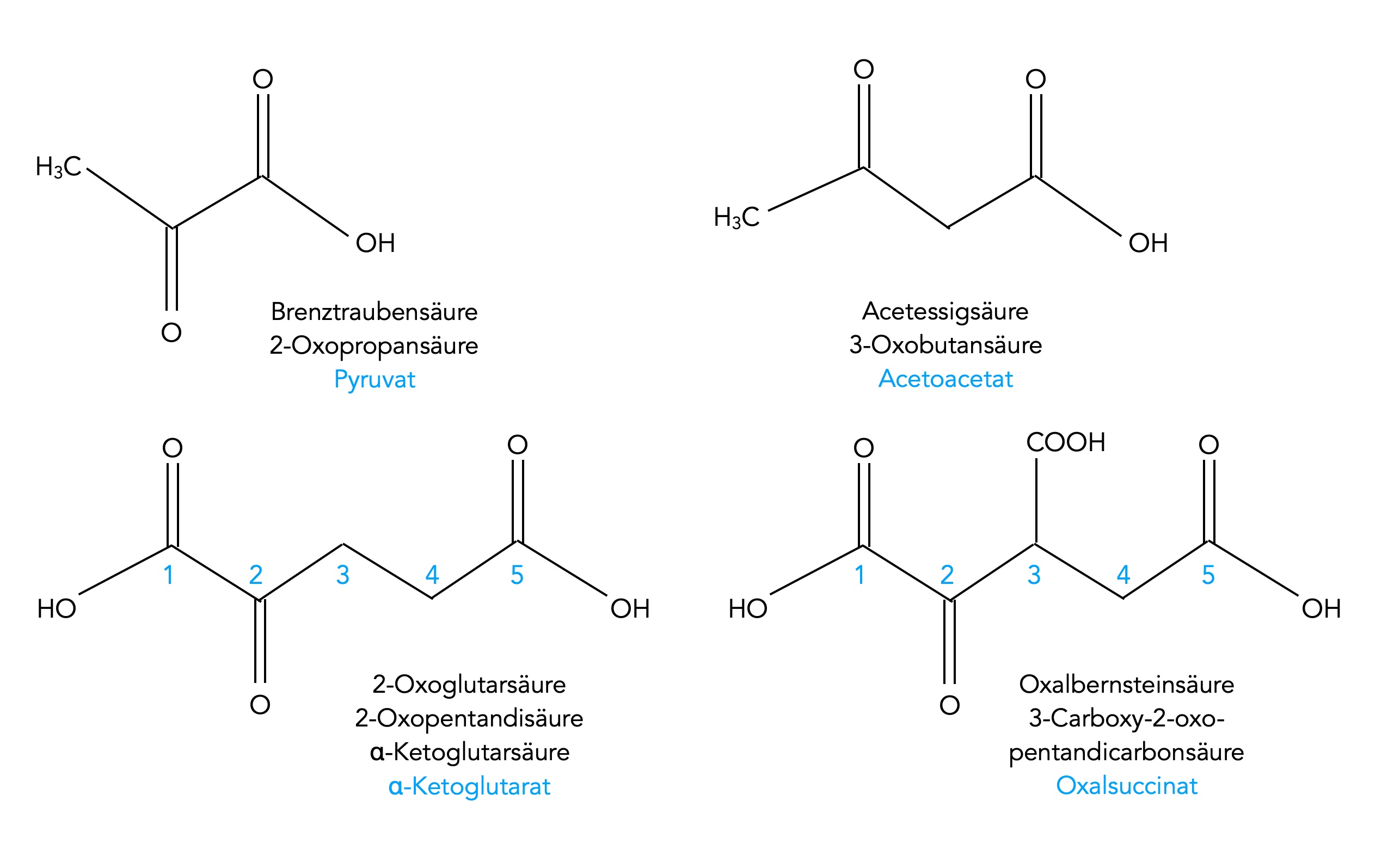 Auf diesem Bild sehen wir vier typische Ketocarbonsäuren, die Brenztraubensäure, die Acetessigsäure, die α-Ketoglutarsäure und die Oxalbernsteinsäure.