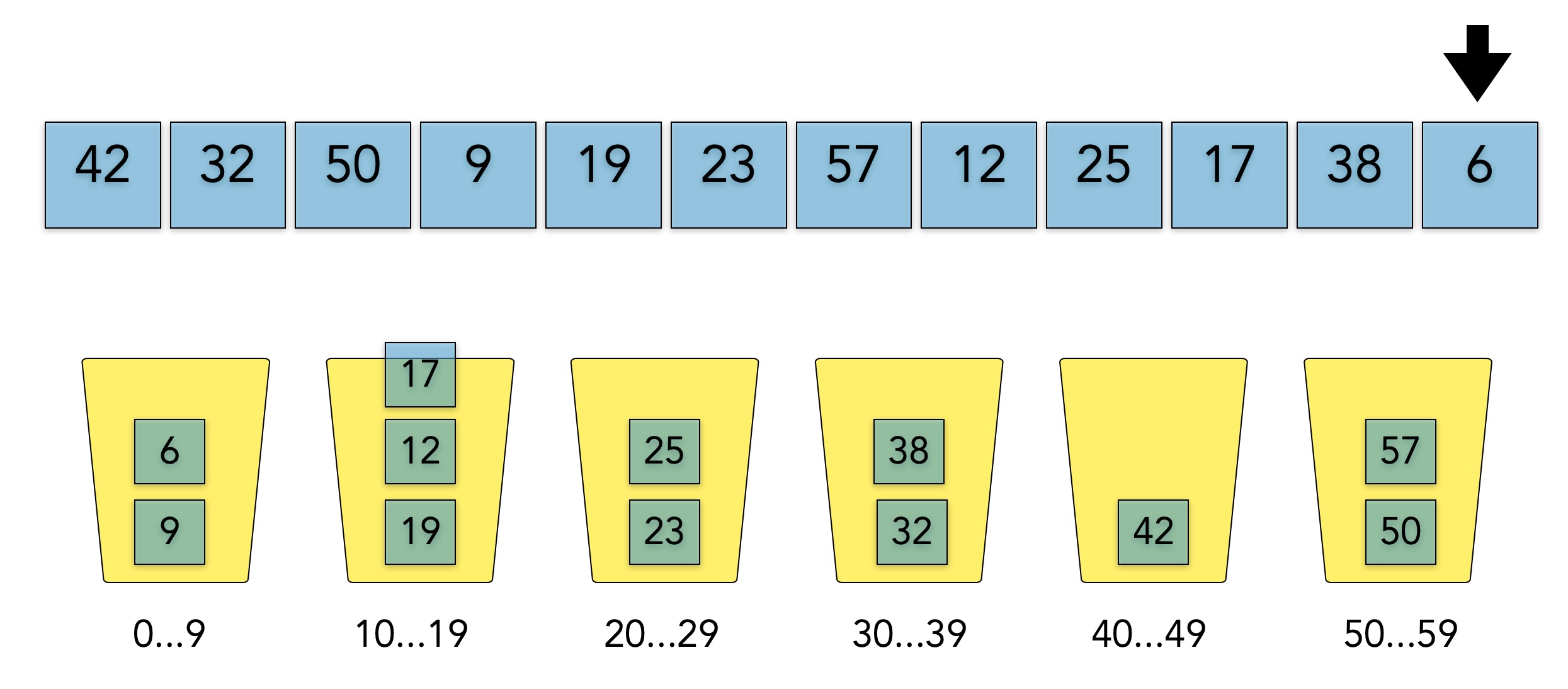 Dieses Bild zeigt einen kleinen Array mit Zahlen im Bereich 6 bis 57. In der unteren Reihe sehen wir sechs Eimer, engl. Buckets, die Arrayelemente aufnehmen können. Der erste Eimer ist für die Zahlen 0 bis 9 zuständig, der zweite für die Zahlen 10 bis 19 und so weiter. Der letzte Eimer schließlich kann die Zahlen 50 bis 59 aufnehmen.