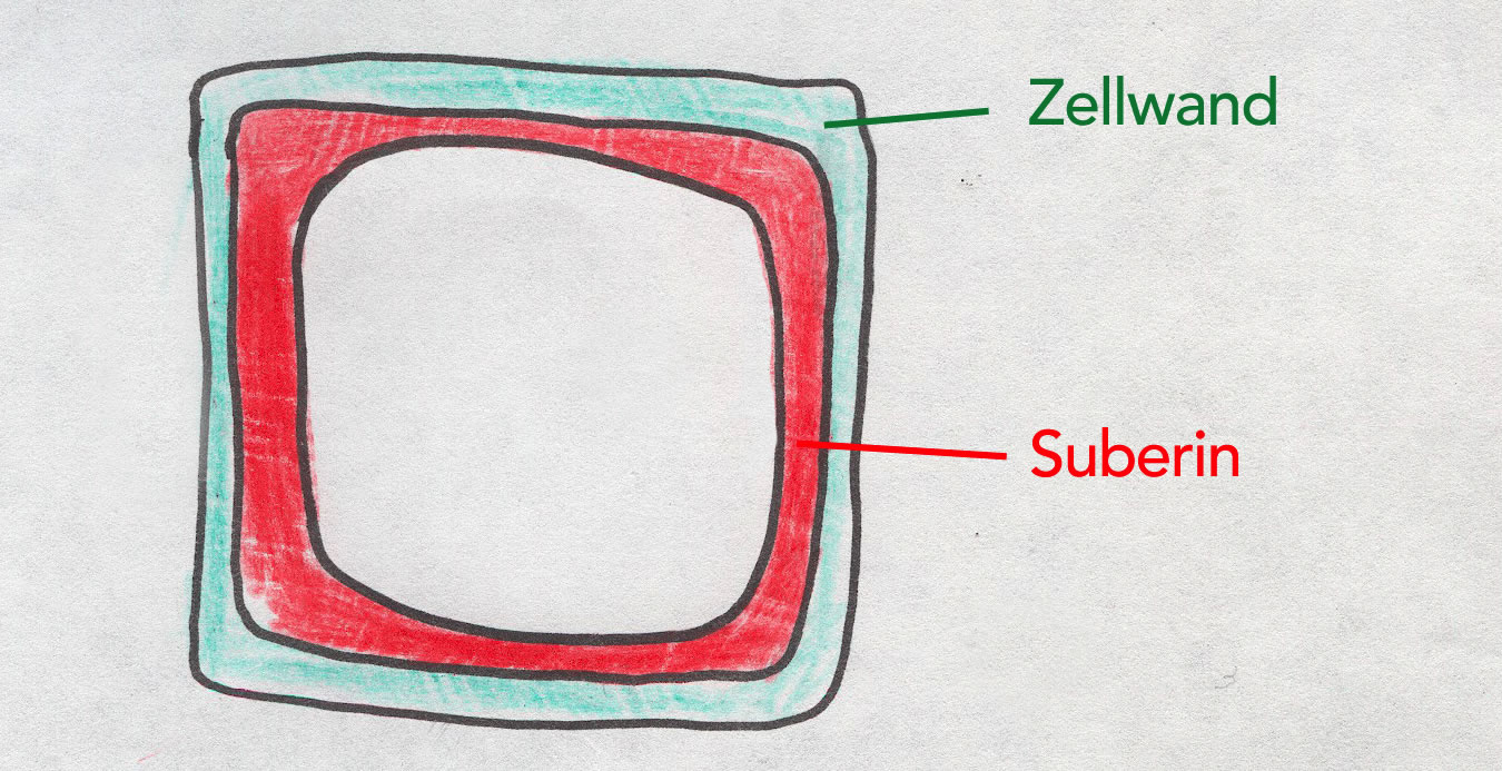 Eine Ablagerung nach innen findet zum Beispiel bei den Korkzellen statt. Dort wird die Substanz Suberin innen auf die Zellwand aufgelagert: