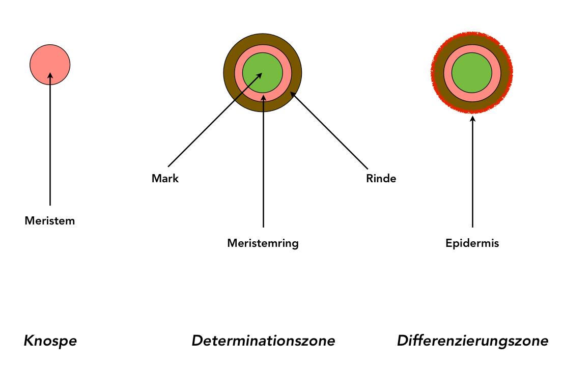 In der ca. 0,02 mm langen Determinationszone geht aus dem Meristem nach außen eine Rinde und nach innen ein Mark hervor, beides parenchymatische Dauergewebe. Eine Epidermis ist noch nicht vorhanden. Das Meristem erscheint im Querschnitt bereits ringförmig.
