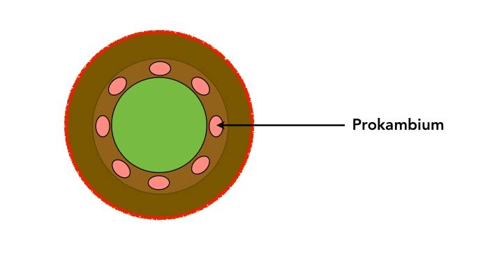 Aus diesen Prokambiumsträngen entstehen neue Dauergewebe: Nach innen Tracheen und Tracheiden, also Xylem-Elemente, und nach außen Siebzellen und Siebröhren, also Phloem-Elemente (siehe Leitgewebe).
