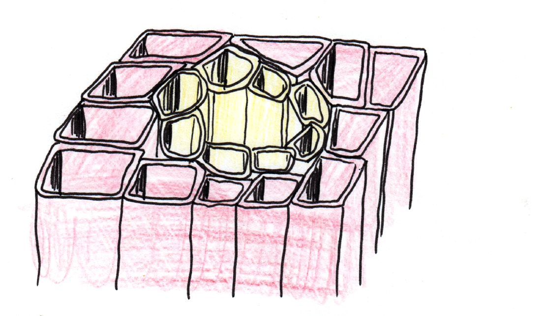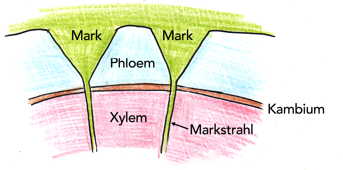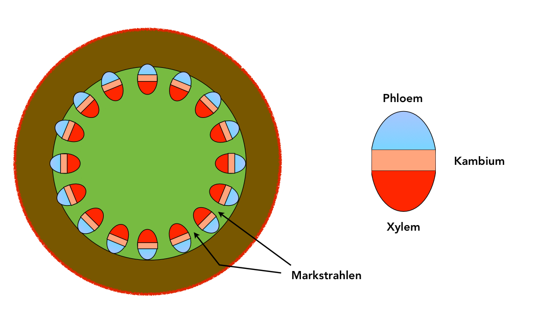 Zwischen den einzelnen Leitbündeln liegen die Markstrahlen. Diese bestehen aus Grundgewebe. Ein Teil dieser parenchymatischen Zellen kann nun seine Teilungsfähigkeit wiedererlangen. Und zwar diejenigen Zellen, die mit den Kambium der benachbarten Leitbündel eine Linie bilden (in der nächsten Abbildung hellgrün gekennzeichnet):
