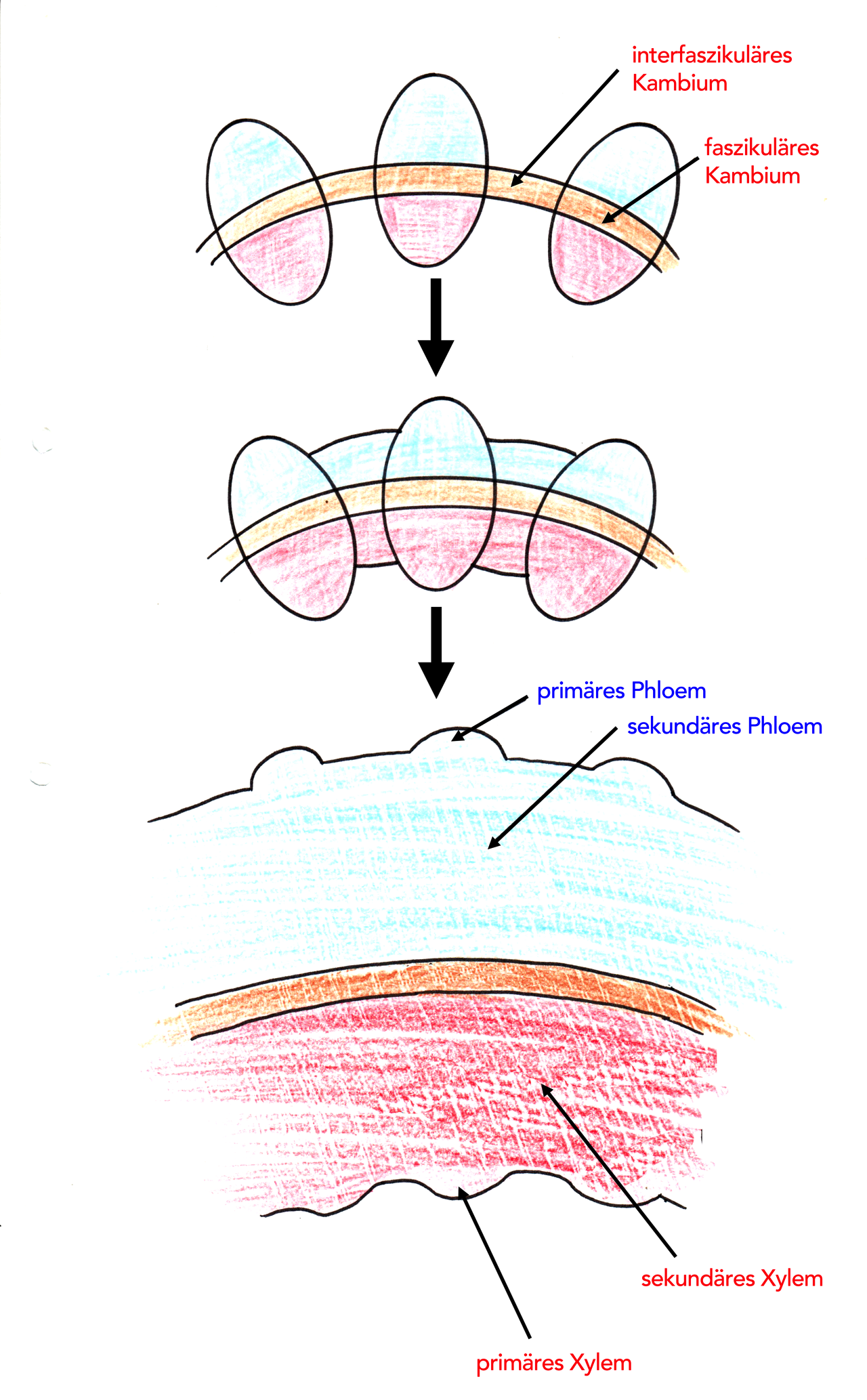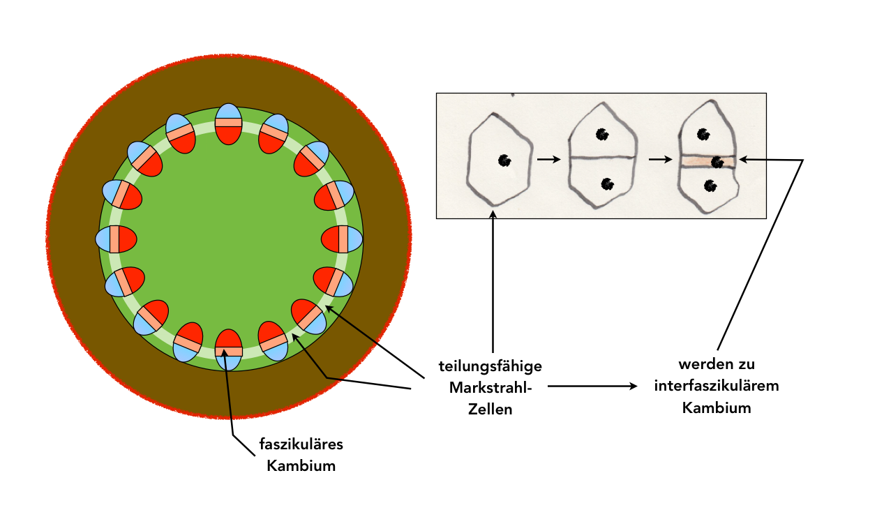 Die Teilung dieser Markstrahlzellen erfolgt in zwei Schritten, so wie oben rechts in der Abbildung angedeutet. Die mittlere, kleine Tochterzelle ist zu einer interfaszikulären Kambiumzelle geworden. Sie ist teilungsfähig und erzeugt nun, genau wie das faszikuläre Kambium der Leitbündel, nach außen Phloem- und nach innen Xylemelemente.