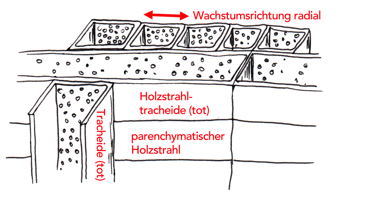 Diese Holzstrahlen der Gymnospermen können entweder aus nur einer Zellreihe bestehen, aber auch aus mehreren zusammengesetzt sein. In diesem Fall können die jeweils obere bzw. untere Zellreihe abgestorben und tracheidal sein. Diese Holzstrahltracheiden erleichtern den Wassertransport in radialer Richtung.