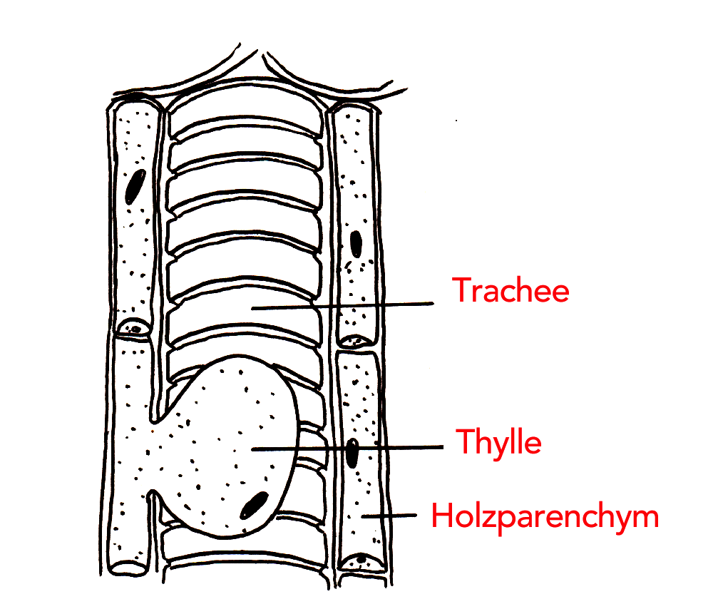 In älteren Schichten des Holzteils können die longitudinal verlaufenden Parenchymzellen in die Tracheen hineinwachsen und diese unter Freisetzung chemischer Stoffe verstopfen. Dieses Phänomen nennt man Thyllenbildung. Das so veränderte Holz ist durch Einwirkung freigesetzter Gerbstoffe und Farbstoffe oft dunkel gefärbt. Man nennt es dann Kernholz.