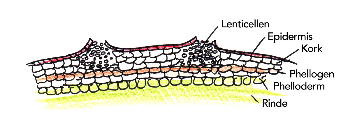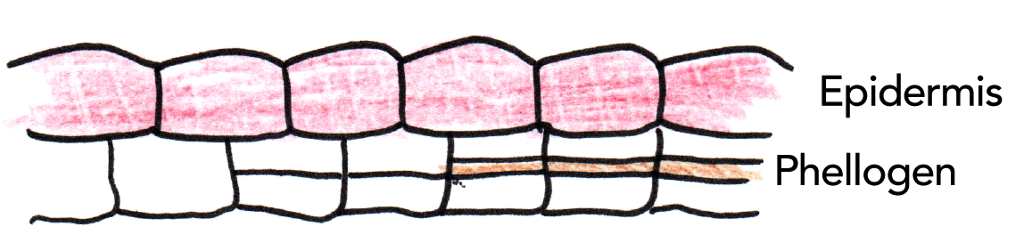Auch die Epidermis vermag dem sekundären Dickenwachstum nicht zu folgen und reißt auf. Aus den unter der Epidermis liegenden Zellen bildet sich durch inäquale Teilungen eine sekundäre Meristemschicht, das Phellogen: