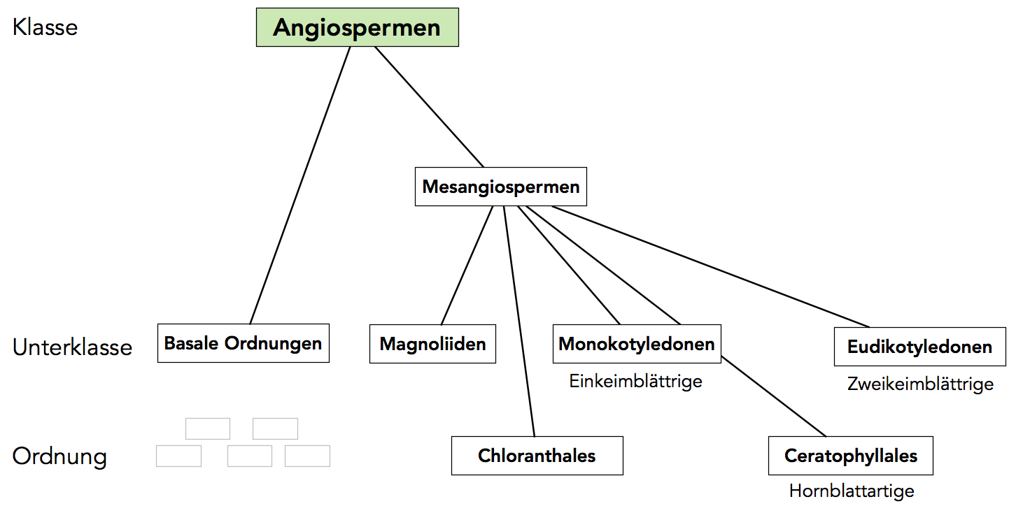 Die innere Systematik der Angiospermen bzw. Bedecktsamer hat sich in den letzten 20 Jahren dank molekulargenetischer Analysen (DNA-Stammbäume) stark verändert und ist inzwischen unüberschaubar komplex geworden. Ich versuche hier einmal, eine stark vereinfachte Version der inneren Systematik zu beschreiben und stütze mich dabei auf den Strasburger [1] , das Buch von Gemeinholzer [2] sowie die deutsche Wikipedia [3].