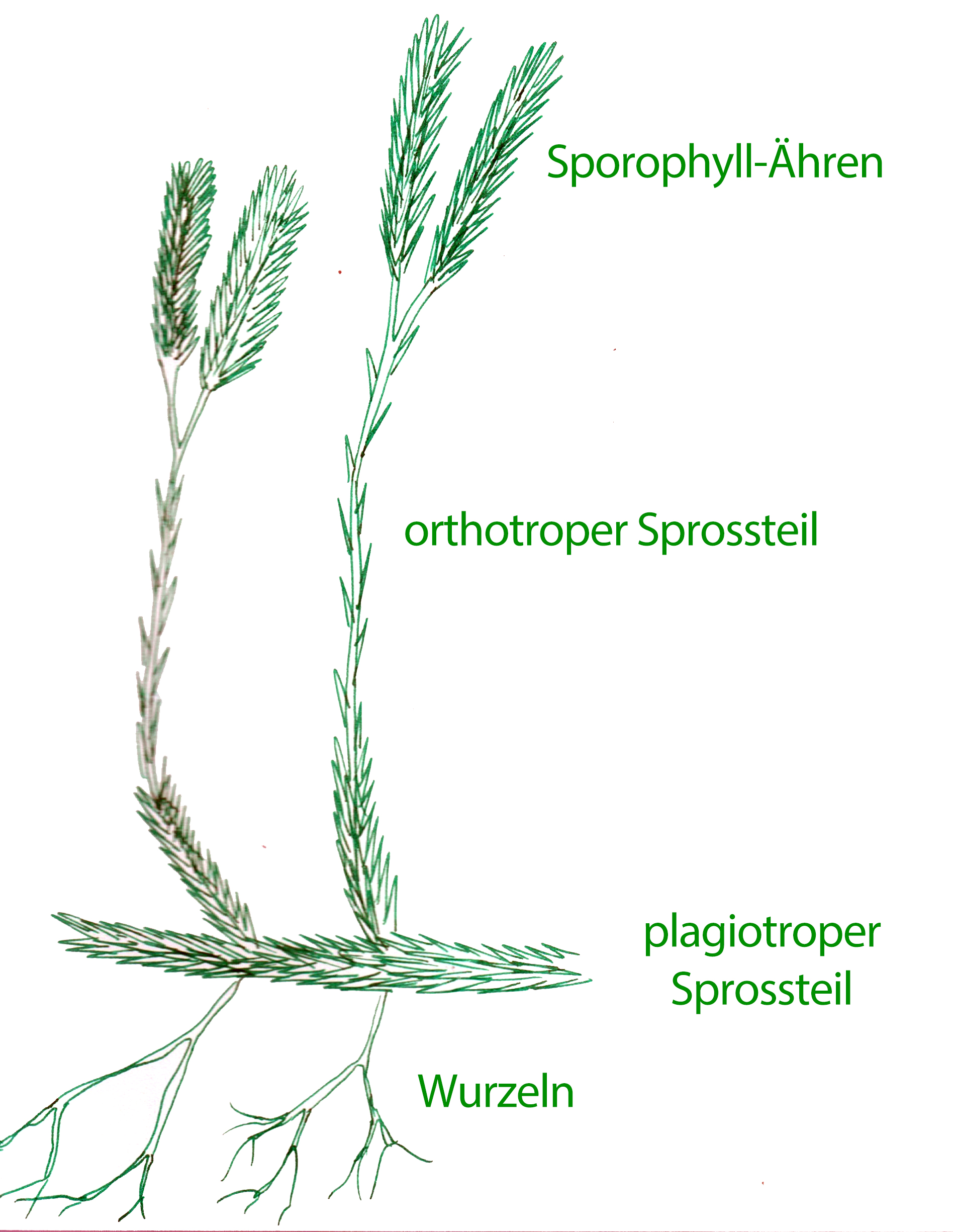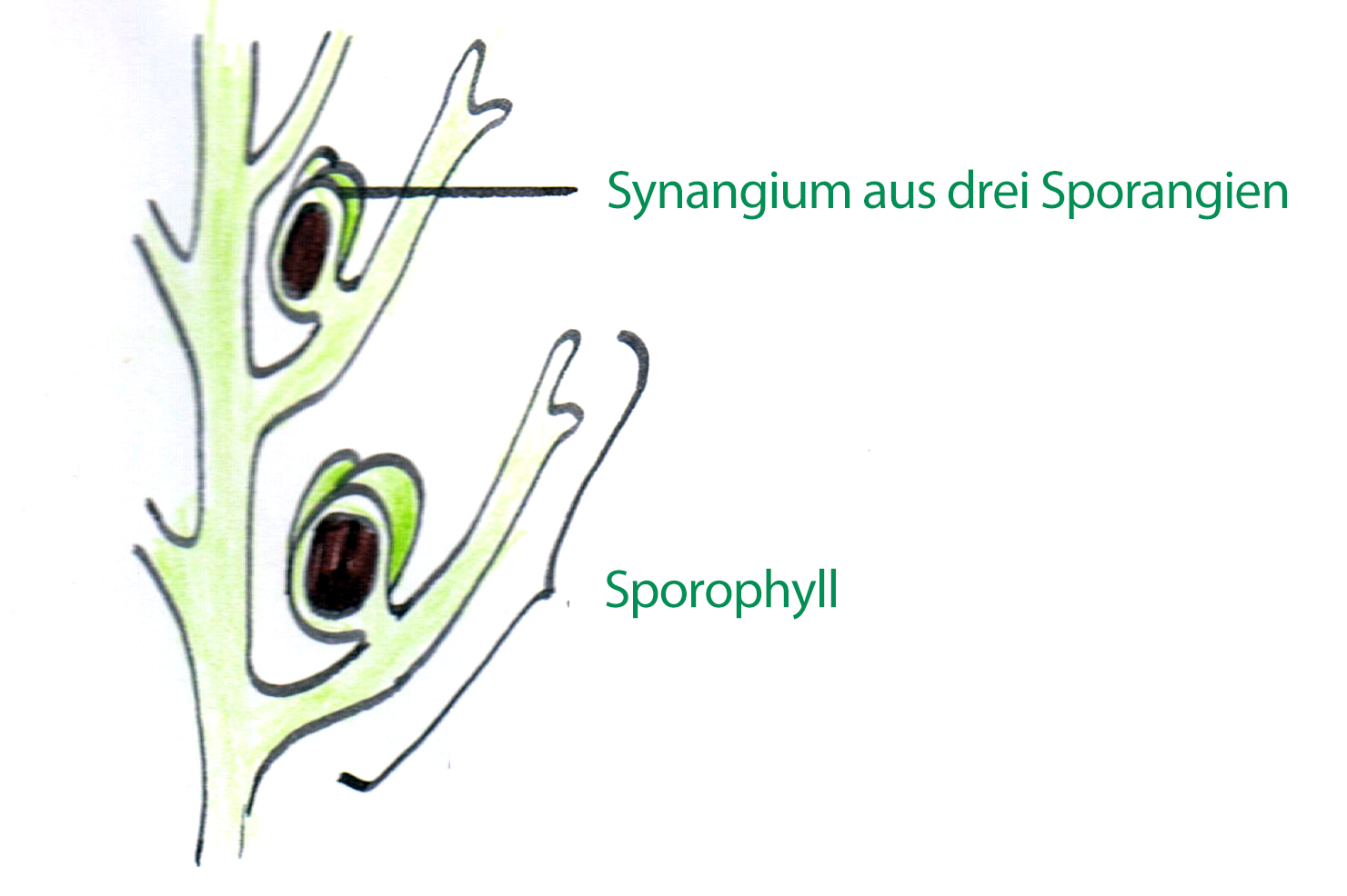 An den aufrecht stehenden Sprossachsen (orthotrop) befinden sich kolbenförmige Sporophyll-Ähren. Diese bestehen aus besonders dicht angeordneten Sporophyten, also kleinen Blättchen, die je ein Synangium aus drei Sporangien tragen.
