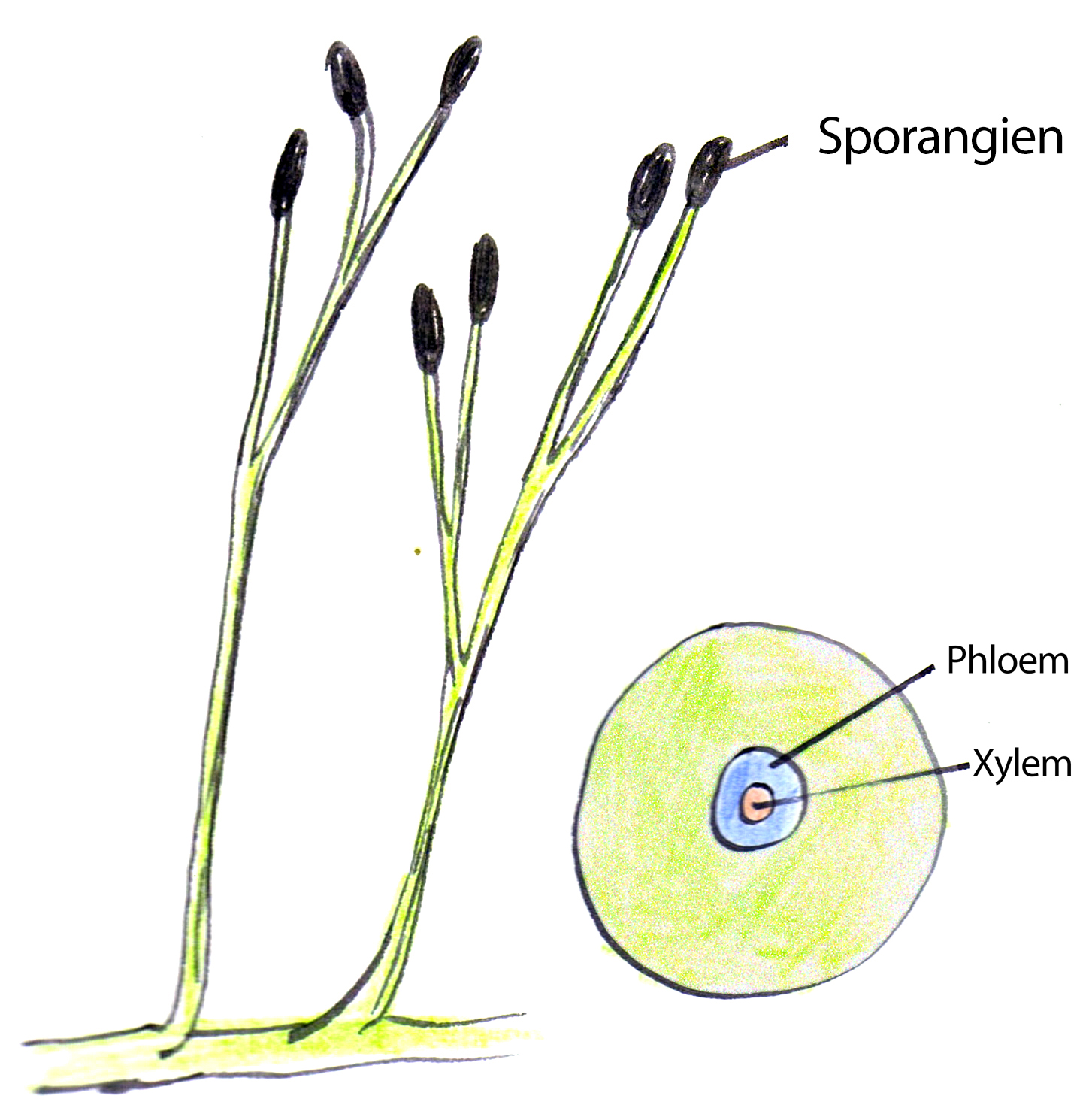 Rhynia, eine Telompflanze, und ein Querschnitt durch den Stängel