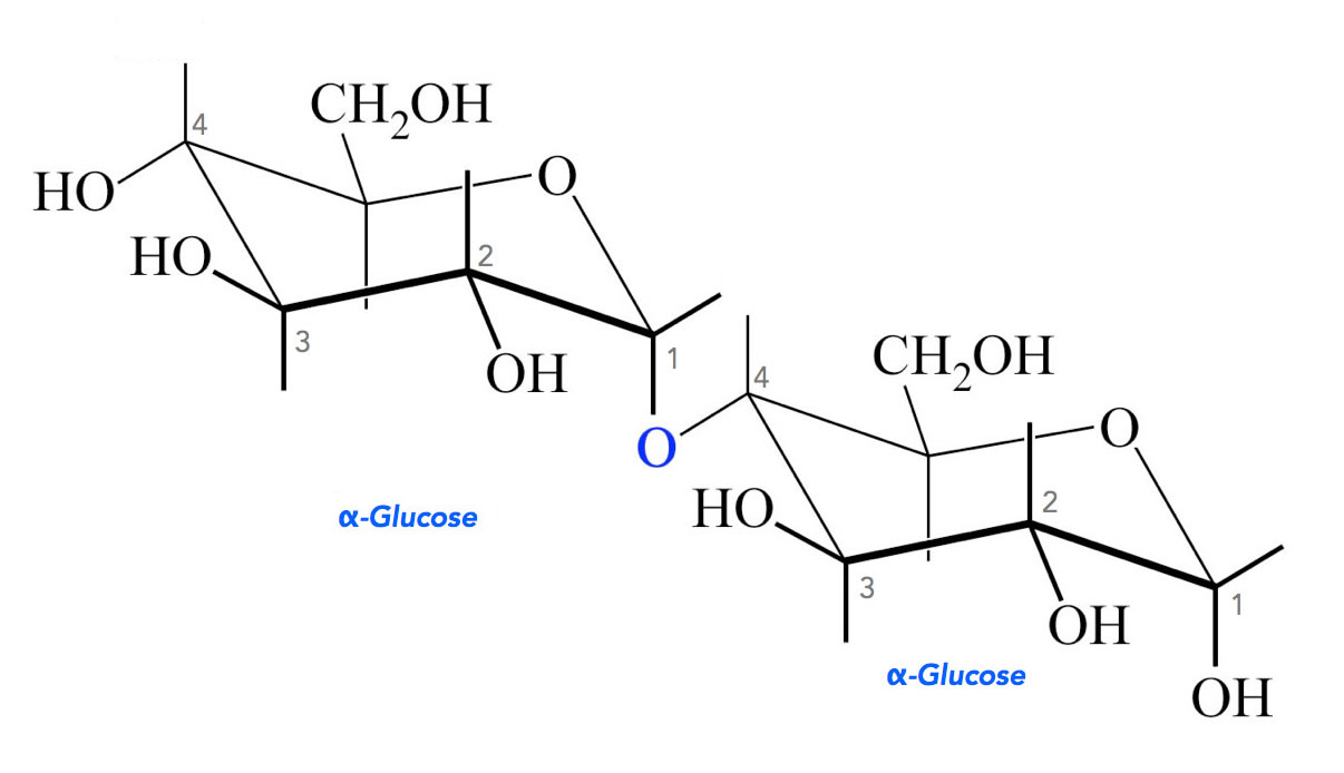 Das Maltose-Molekül besteht aus zwei α-Glucose-Bausteinen, ist also quasi ein Glucose-Dimer: