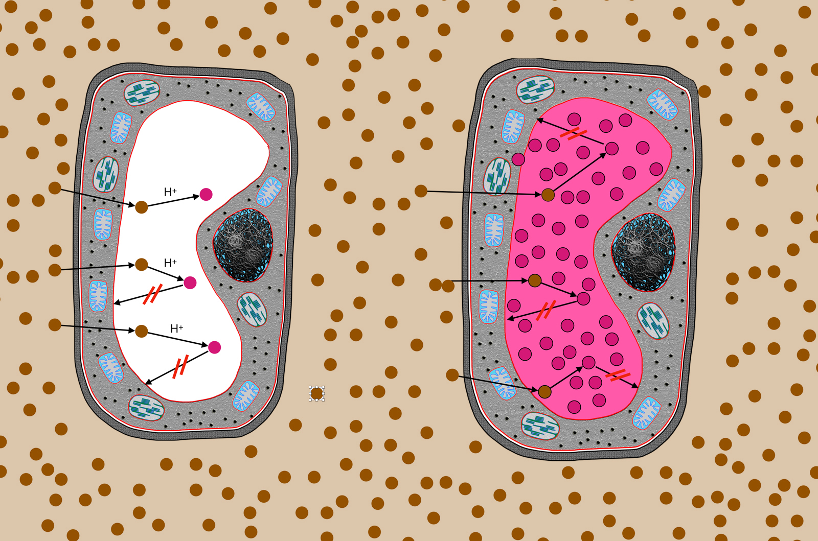 Die Konzentration der NR-Moleküle im Zellsaft der Vakuole bleibt daher immer sehr gering (Abbildung 2, rechtes Bild). Das heißt, der Konzentrationsunterschied bleibt bestehen, und ständig diffundieren weitere NR-Moleküle in die Vakuole. Sobald sie in der Vakuole aber in die rot-violetten NR-Ionen umgewandelt sind, können sie die Vakuole nicht mehr verlassen. Sie sitzen in der Falle, in der Ionenfalle.