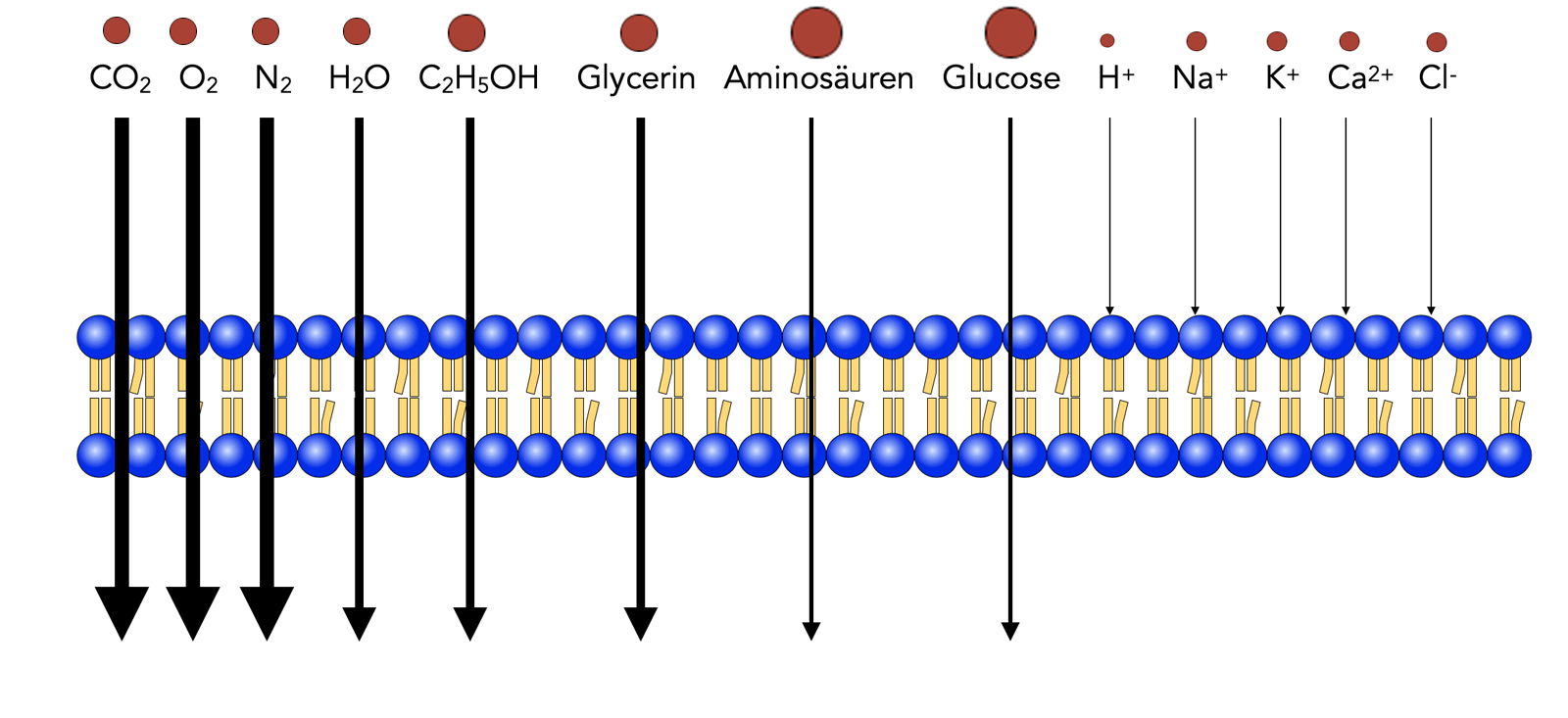 Die roten Kugeln über den Molekülen bzw. Ionen deuten die ungefähre Größe dieser Teilchen an. Die Dicke der Pfeile steht für die Durchlässigkeit der Membran für die jeweilige Teilchensorte.