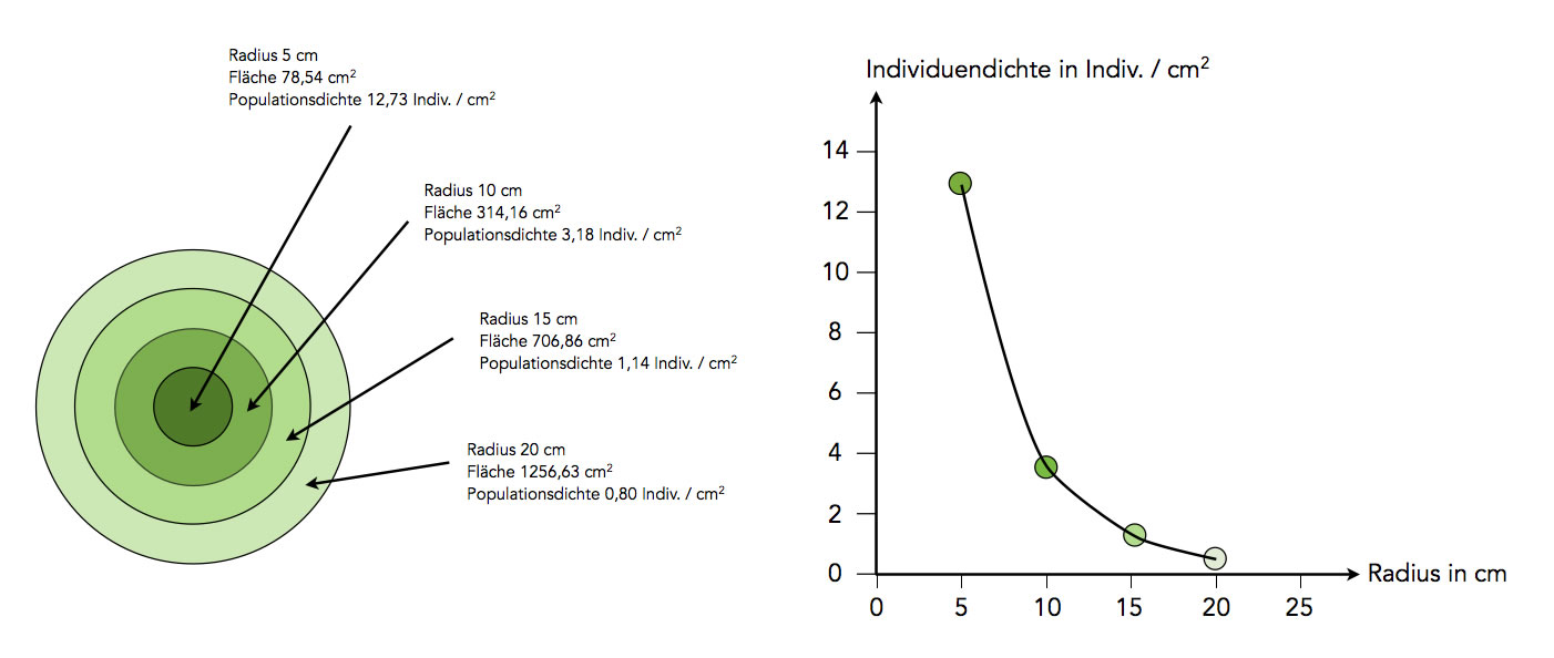 Stellen wir uns wieder die Aktion mit dem Becherglas voller Marienkäfer vor. Nehmen wir besser Milben, die sind viel kleiner als Marienkäfer. Wir geben ein Becherglas mit 1000 Milben auf eine runde Fläche mit einem Radius von 5 cm. Der Flächeninhalt dieses Kreises beträgt 78,54 cm2. Die Individuendichte oder Populationsdichte auf dieser Fläche liegt dann bei 12,73 Individuen pro cm2.