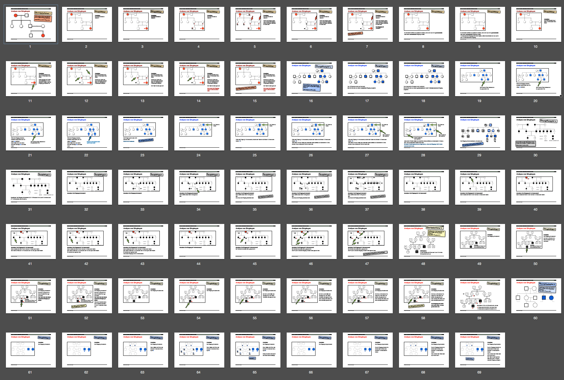 Der Foliensatz ist deshalb so umfangreich, weil jeder Stammbaum Schritt für Schritt analysiert wird. Zunächst wird eine Hypothese aufgestellt, beispielsweise dass der Erbgang rezessiv - autosomal ist. Dann werden die beiden Aspekte dieser Vermutung Schritt für Schritt überprüft.