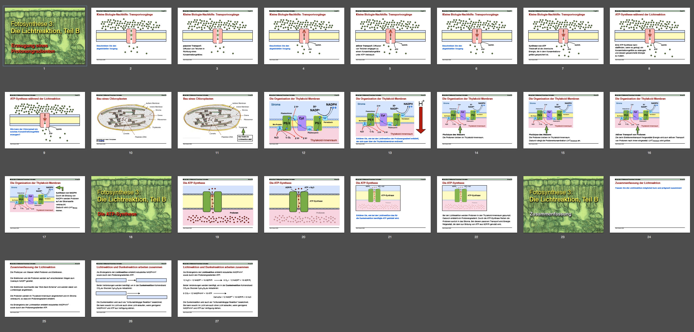 Dies ist der zweite Teil des sehr umfangreichen Foliensatzes über die Lichtreaktion, und eigentlich ist der Foliensatz immer noch nicht vollständig. So wurde beispielsweise auf eine nähere Betrachtung des Chlorophyll-Moleküls verzichtet. Diesen Teil werde ich bei Gelegenheit noch nachreichen.