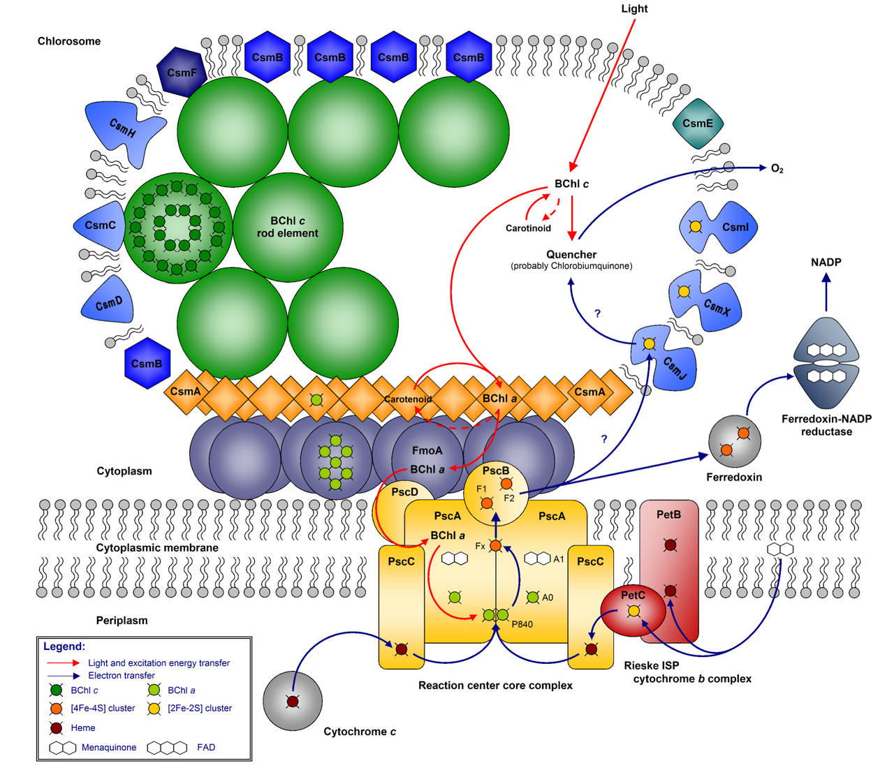 Das Reaktionszentrum P840 liegt in der Außenmembran der Bakterien, während die Antennenpigmente in sogenannten Chlorosomen untergebracht sind.
