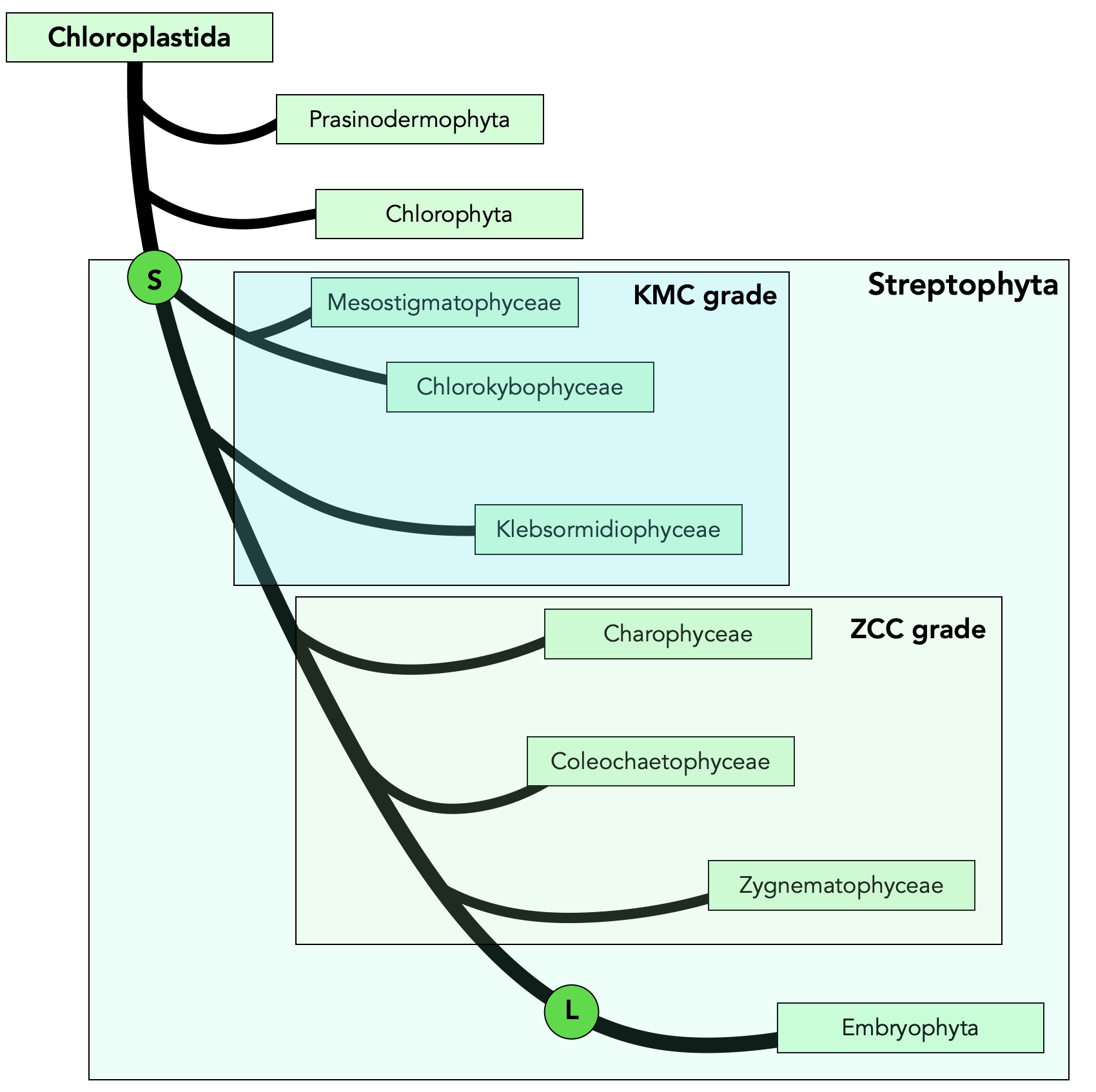 S = Letzter gemeinsamer Vorfahr der Streptophyta, L = erste Landpflanze