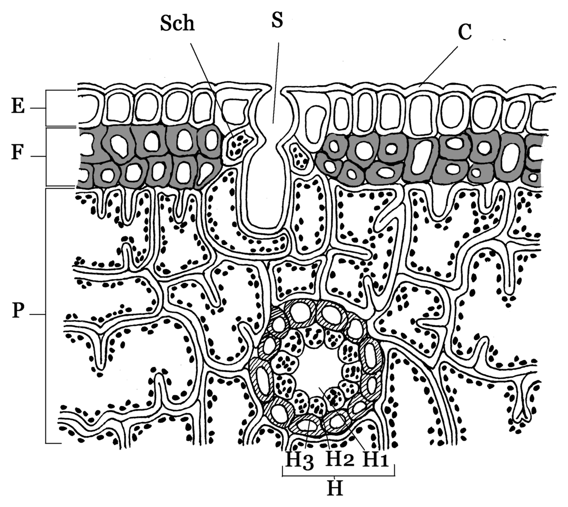C = verdickte Cuticula, E = Epidermis, F = totes Festigungsgewebe