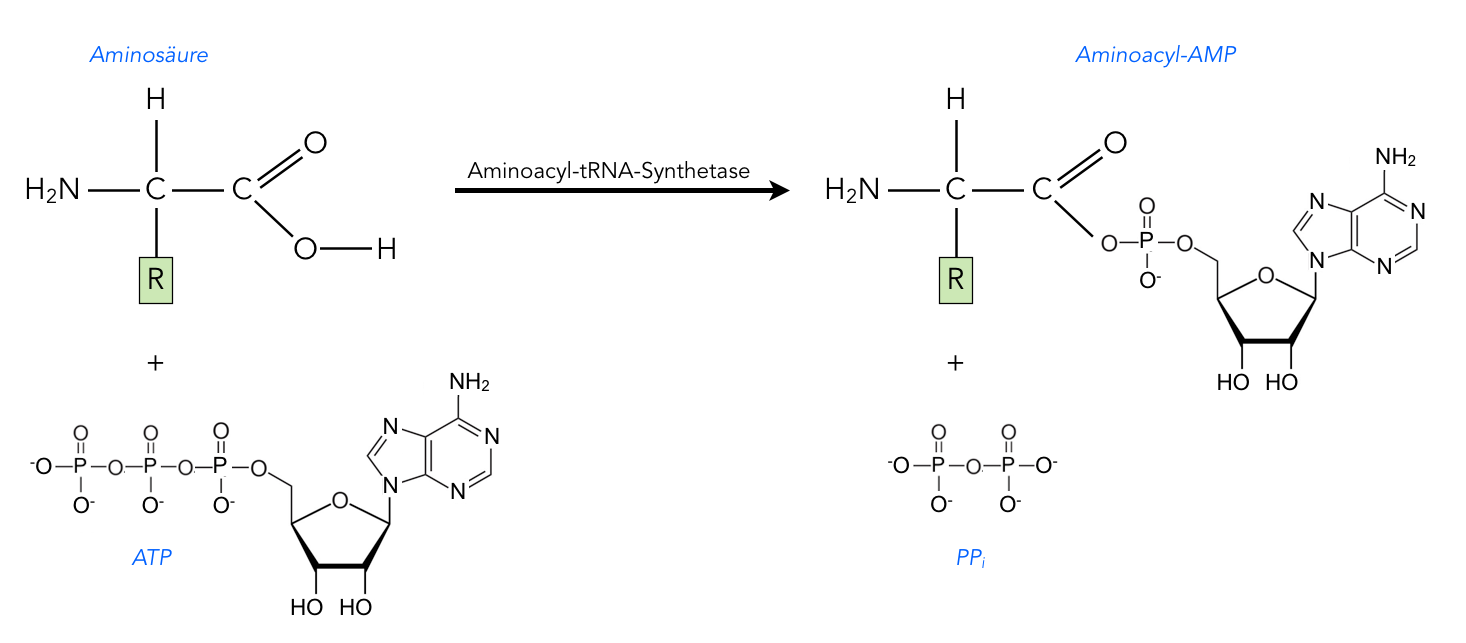 Aminosäure + ATP → Aminoacyl-AMP + PPi