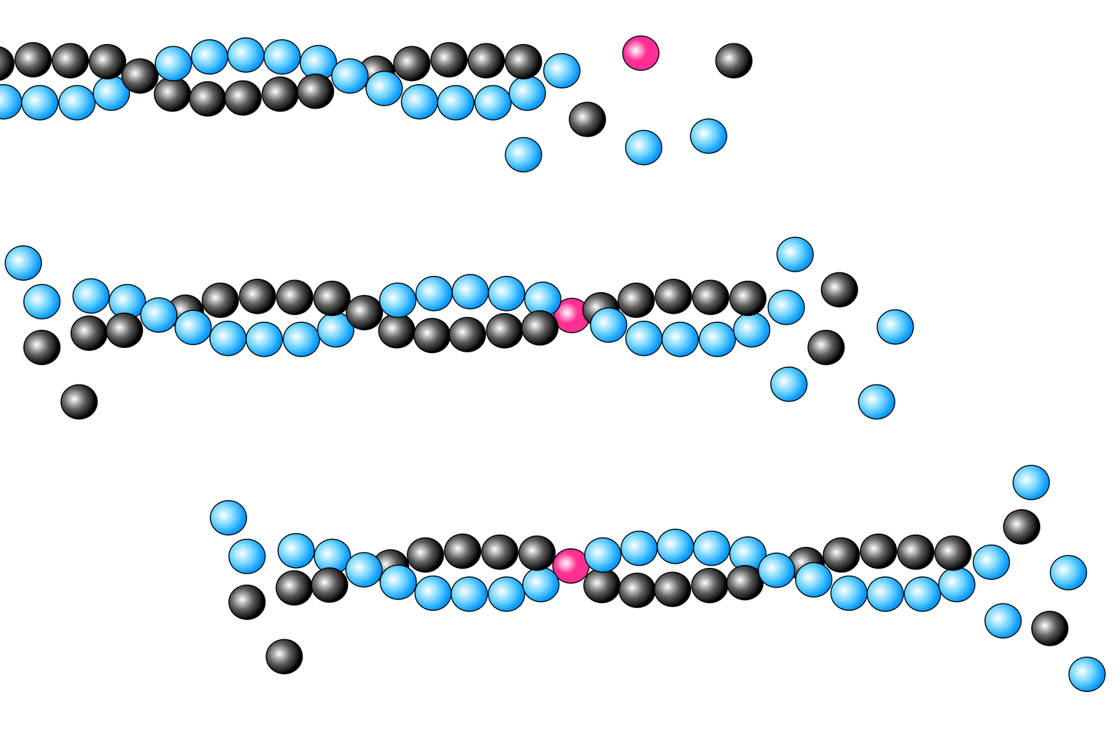 Jedes Actin-Molekül hat zwei Enden, die als Plus- und Minus-Ende bezeichnet werden. Mit Hilfe dieser beiden Enden kann sich ein Actin-Molekül an ein anderes heften und so lange Fäden bilden, die sogenannten Actin-Filamente. Das folgende Bild zeigt die Bildung eines solchen Actin-Filaments in drei Schritten: