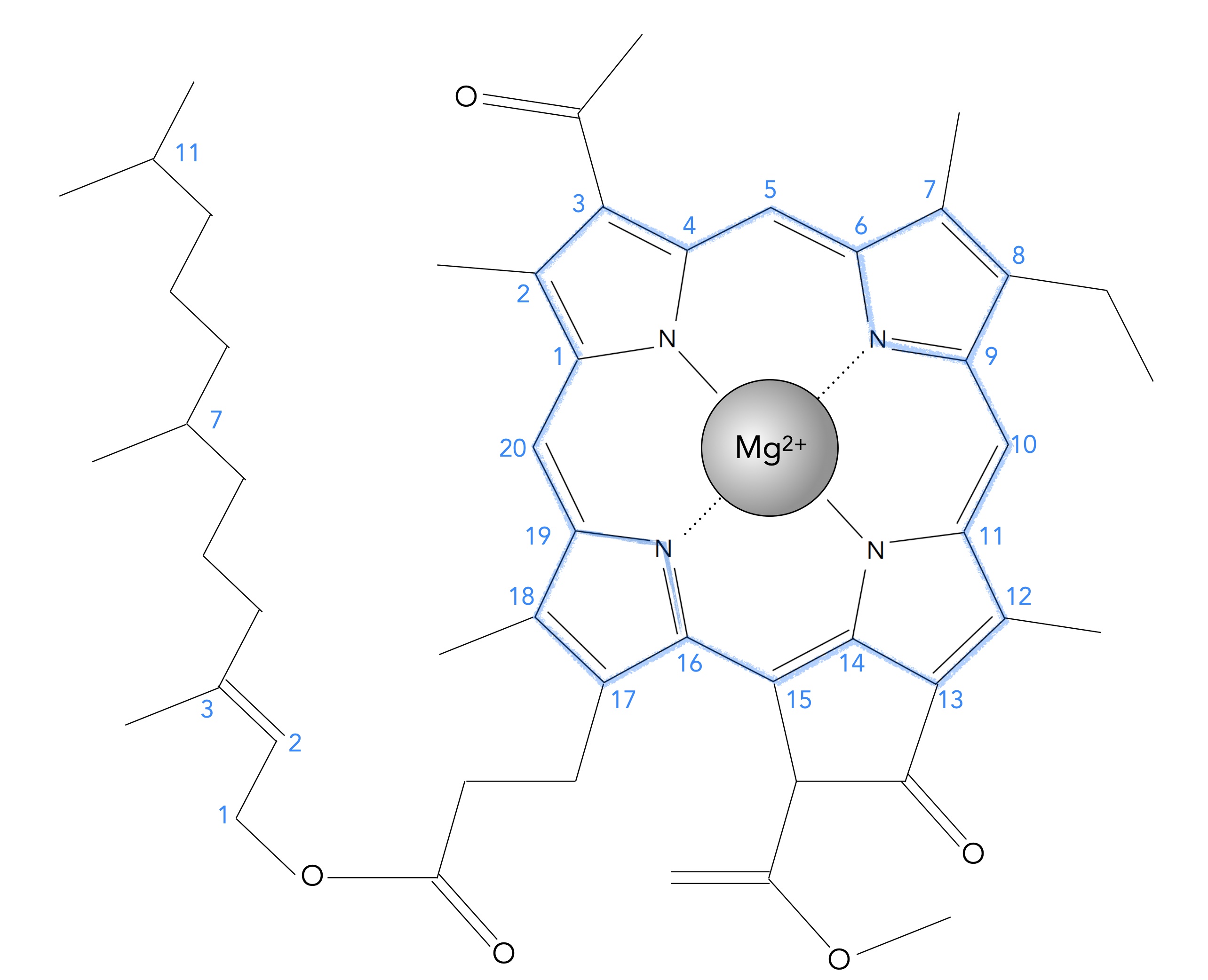 Wenn man sich das Molekül genauer anschaut, stellt man fest, dass es sich kaum von dem pflanzlichen Chlorophyll a unterscheidet. In der Tat, Bacteriochlorophyll wird während seiner Biosynthese aus Chlorophyll a hergestellt.