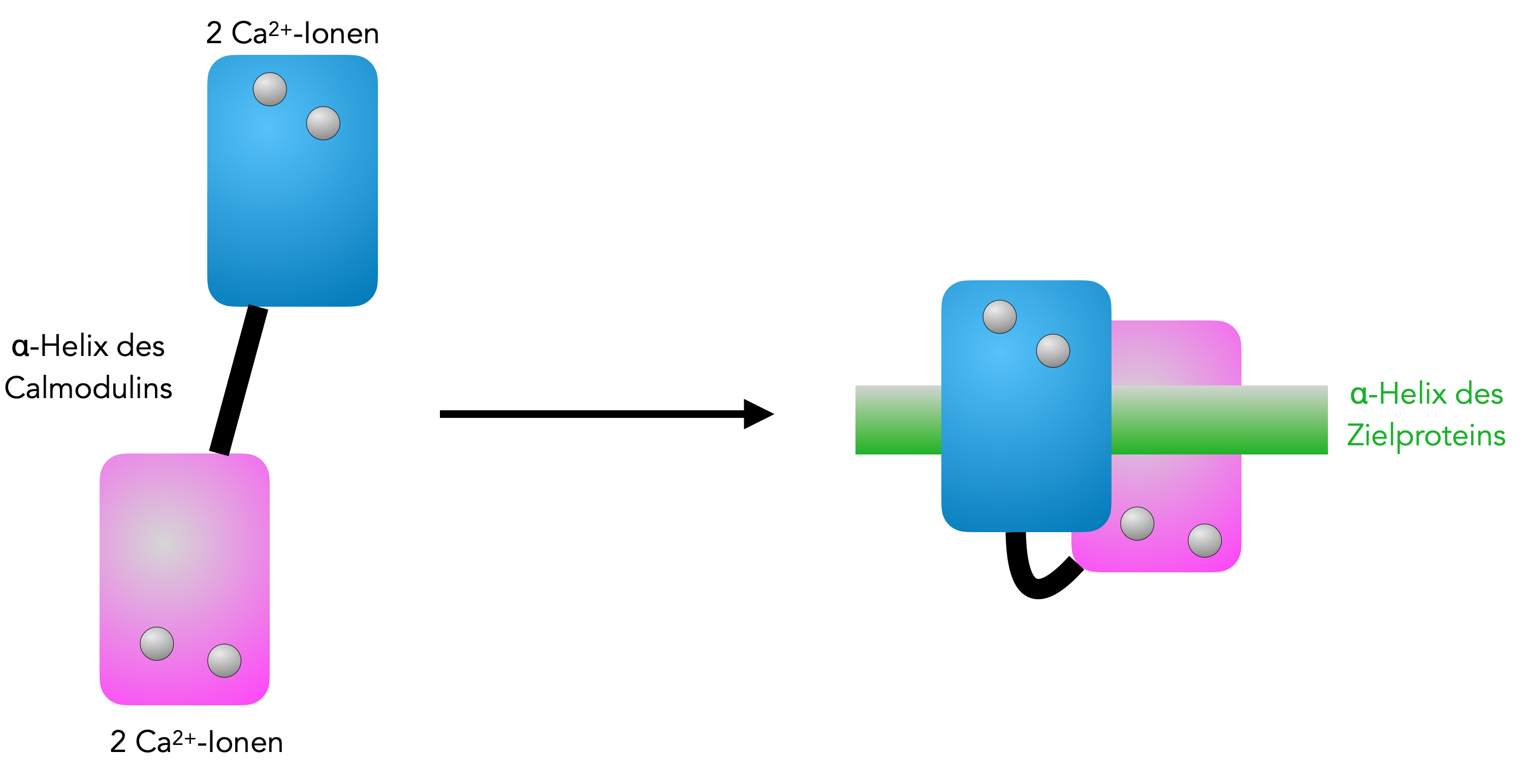 Wenn sich ein Ca2+/Calmodulin-Komplex an die alpha-Helix eines Proteins bindet und dabei seine Konformation ändert (siehe Abb. 1), dann kann das bei diesem Protein ebenfalls eine Konformations-Änderung auslösen, welche dieses Protein dann aktiviert.