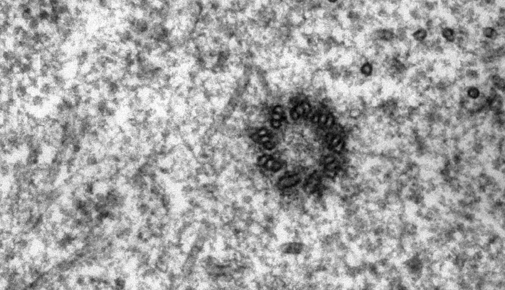 Centriolen sind Mikrotubuli-Gebilde. Im Querschnitt erkennt man neun kreisförmig angeordnete Gruppen von je drei Mikrotubuli. In der nächsten Abbildung ist eine solche Gruppe vergrößert gezeigt: