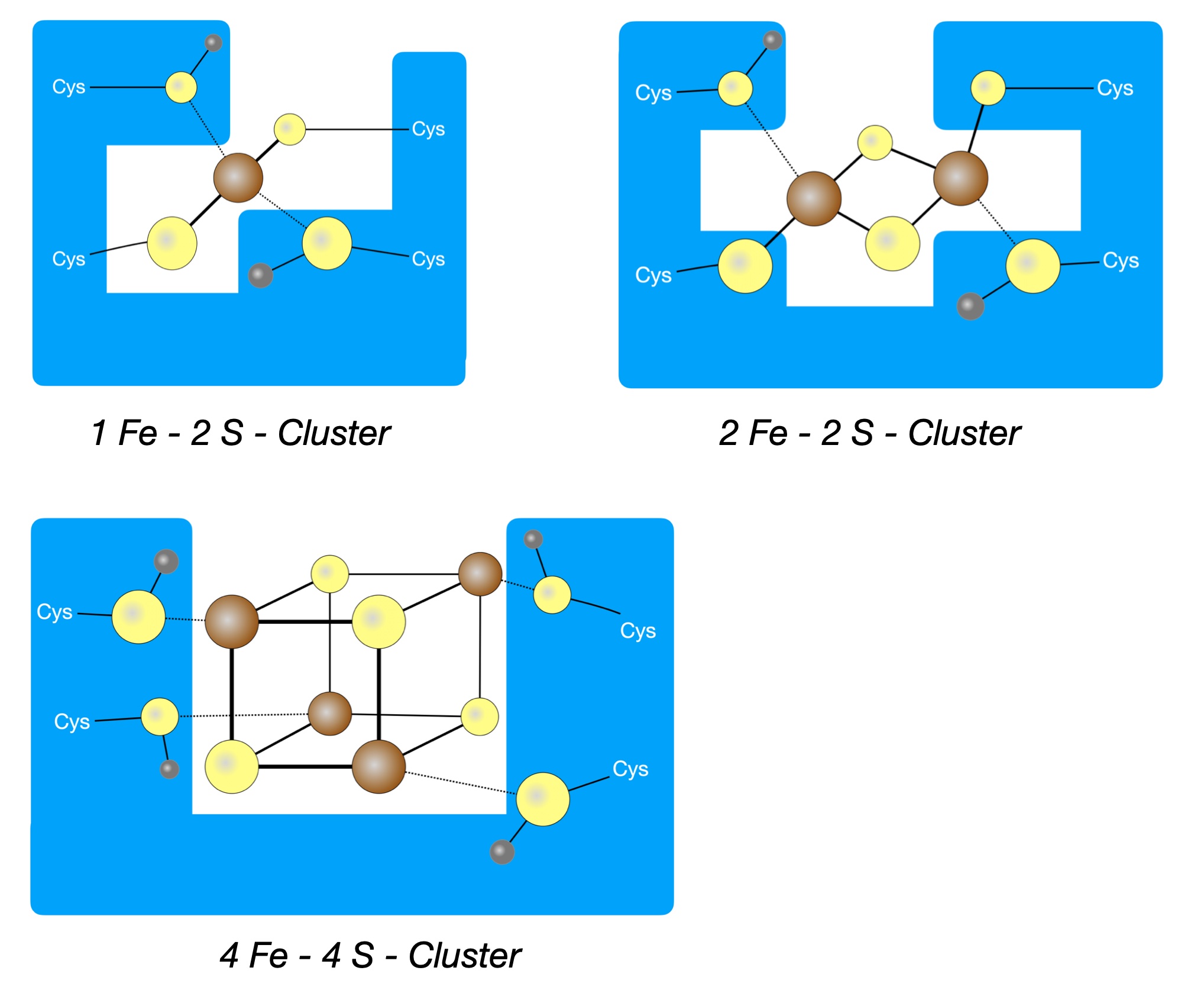 Es gibt verschiedene Arten von Fe-S-Clustern. Die Häm-Eisenproteine wie Hämoglobin behören nicht dazu, diese besitzen zwar Eisen in ihren Molekülen und natürlich auch jede Menge Schwefel-Atome in den Cystein-Resten der Peptidketten, aber keine Fe-S-Cluster.