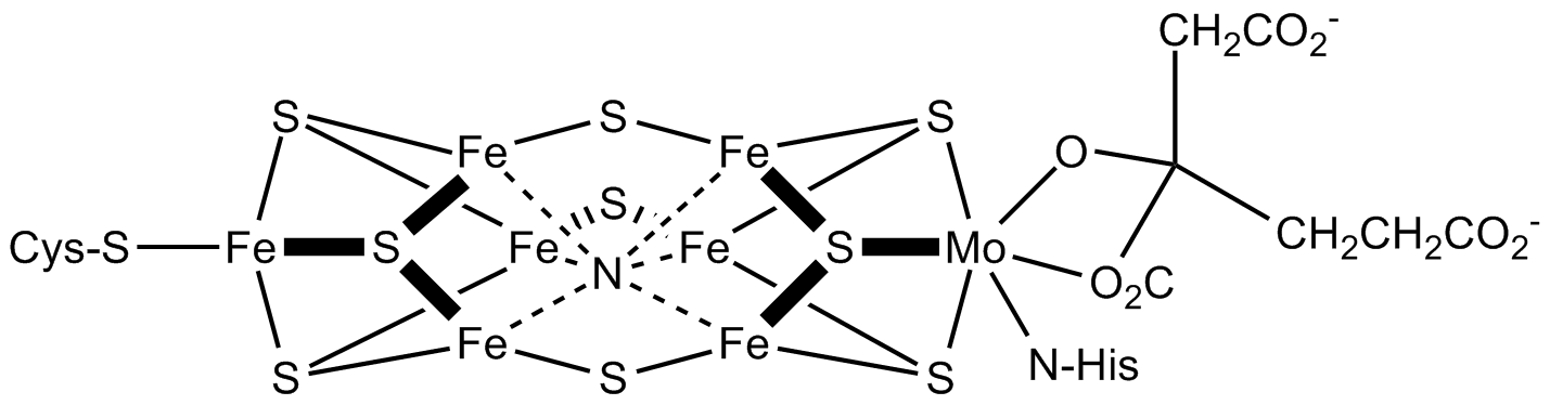 Hier zählen wir sieben Eisen-Atome und neun Schwefel-Atome, und außerdem ein Stickstoff-Atom. Dieses Gebilde ist laut [3] der Cofaktor der Nitrogenase.