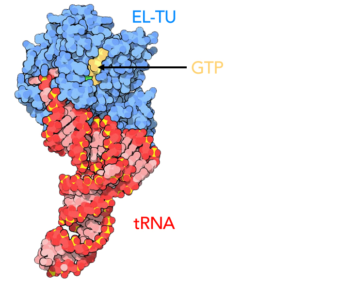 Dieser Elongationsfaktor (TU steht für thermo unstable, also hitzeunbeständig) ist verantwortlich für die Aufnahme der tRNA in die A-Stelle des Ribosoms. Bei EF-TU handelt es sich um ein G-Protein, denn der Elongationsfaktor kann GTP binden und durch dessen Spaltung in GDP und Pi aktiviert werden.
