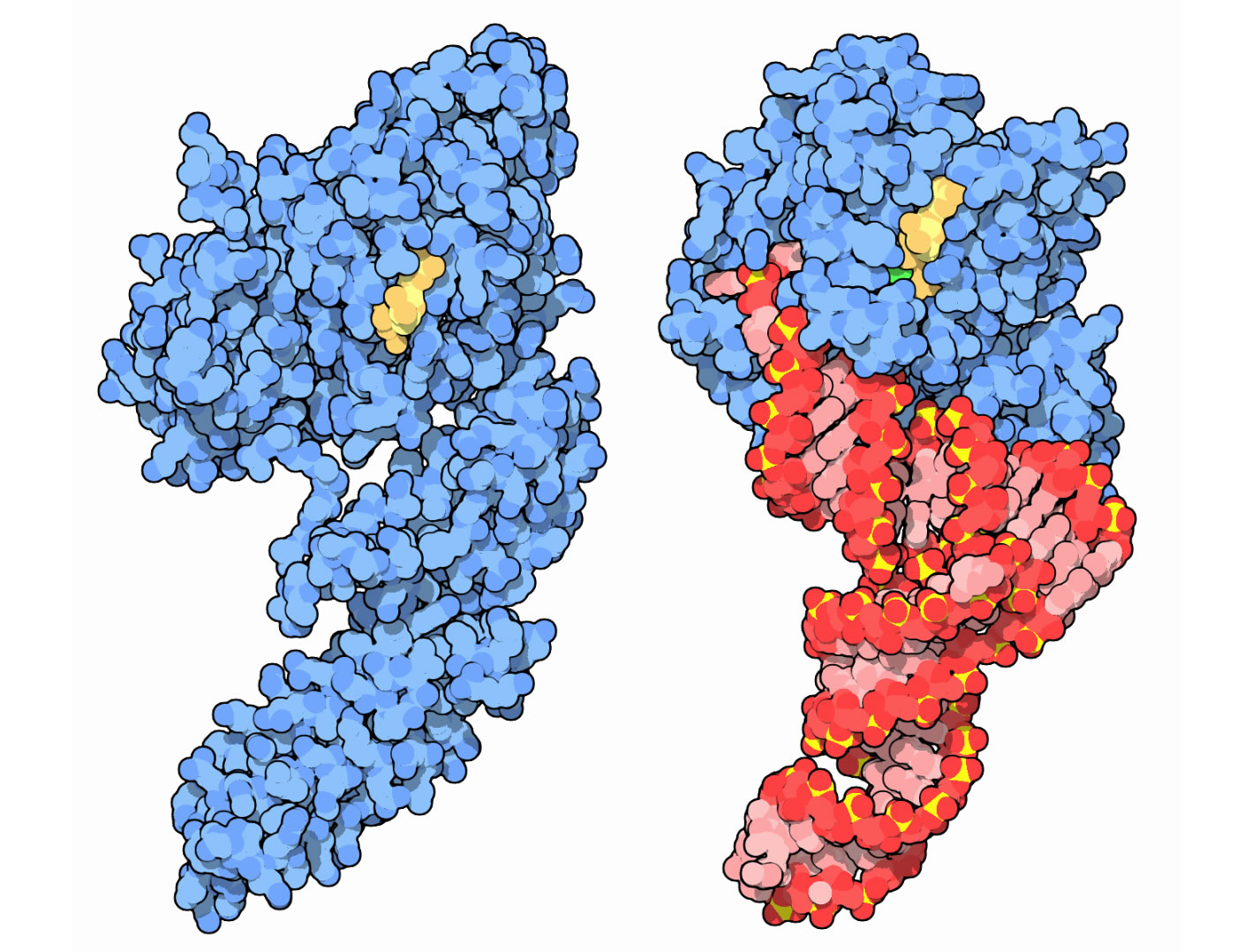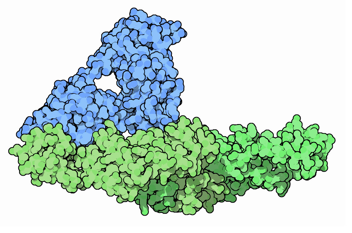 Auf diesem Bild sehen wir den Komplex aus dem bakteriellen Elongationsfaktor EF-TU, einer tRNA und einem GTP-Molekül.