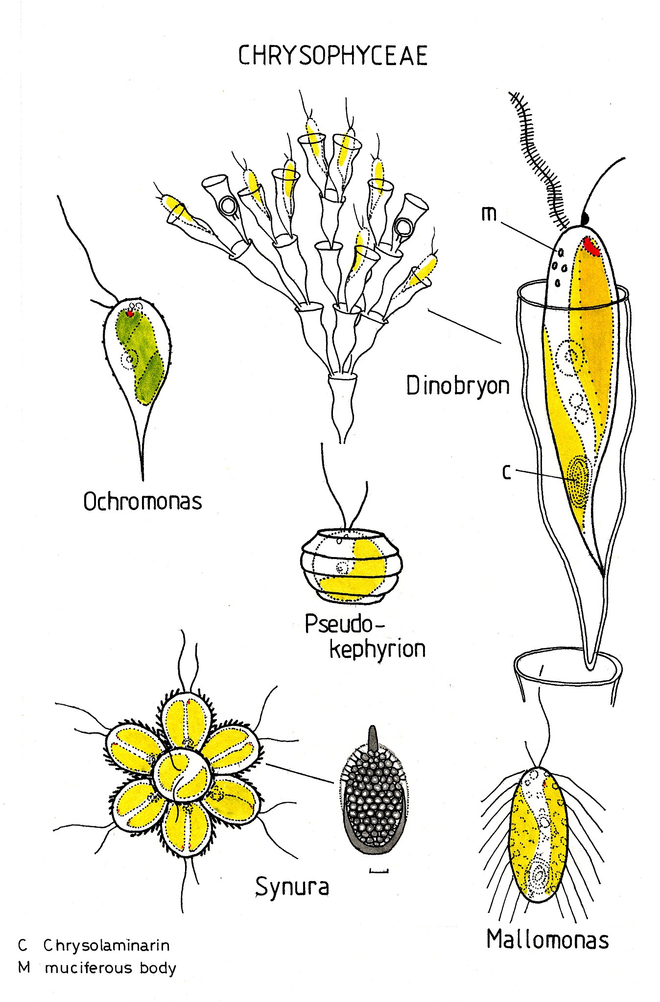Dieses Bild aus der Wikipedia zeigt einen kleinen Teil der Vielfalt der Goldalgen. Die Färbung dieser Algen ist auf die Plastiden zurückzuführen, in denen neben den Photosynthesepigmenten Chlorophyll a und c auch Carotine und vor allem verschiedene Xanthophylle vorhanden sind. Vor allem die Xanthophylle sind für die goldbraune Färbung der Algen verantwortlich.