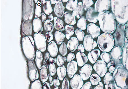Die Wandverdickungen des Ecken- und Plattenkollenchyms bestehen aus sich abwechselnden Cellulose- und Pektinschichten [1].