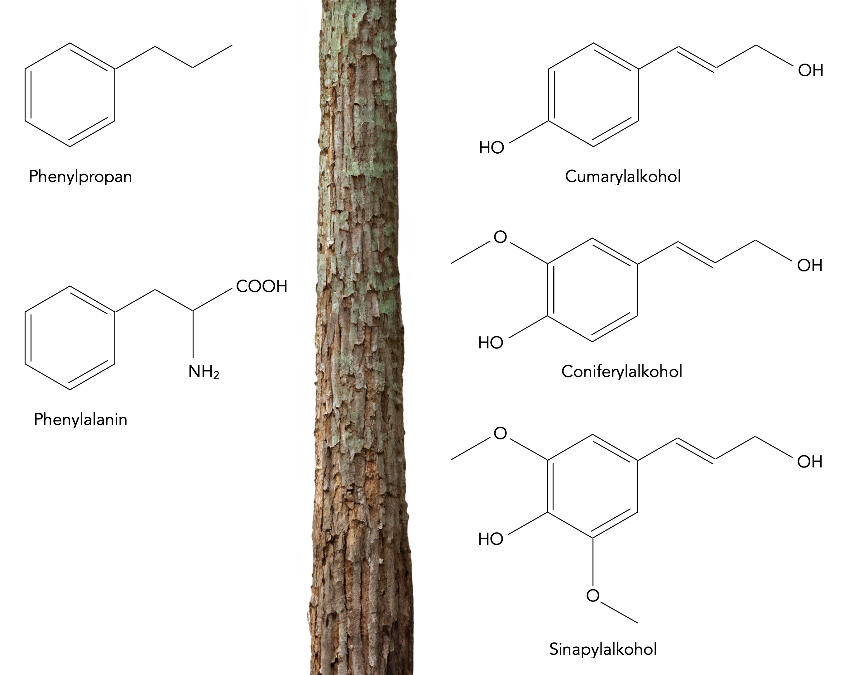 Phenylpropan und Phenylalanin sowie die Lignin-Monomere Cumarylalkohol, Coniferylalkohol und Sinapylalkohol.