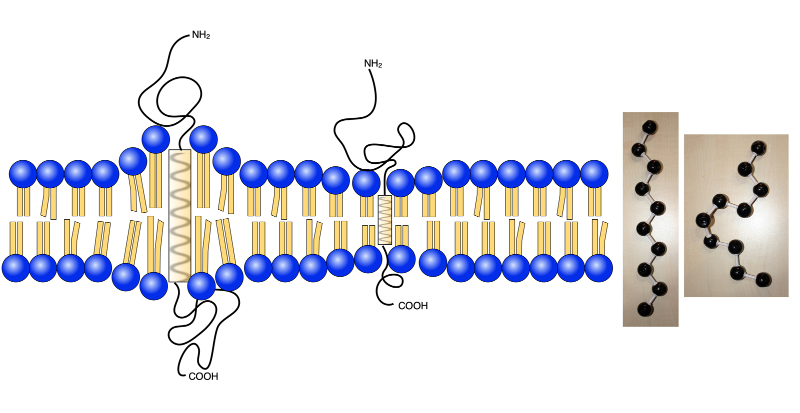 Ist das Transmembranprotein länger, als die Lipid-Doppelschicht dick ist, dann strecken sich die Fettsäure-Reste der Lipide in die Länge. Das Umgekehrte passiert, wenn das Transmembranprotein kürzer ist als die Dicke der Doppelschicht. Ganz rechts sehen Sie Photos von zwei Molekül-Modellen einer Kette aus zehn C-Atomen (stellvertretend für die Fettsäure-Ketten in den Lipid-Molekülen). Einmal die langgestreckte Konformation, rechts daneben die viel kürzere gestauchte Konformation.