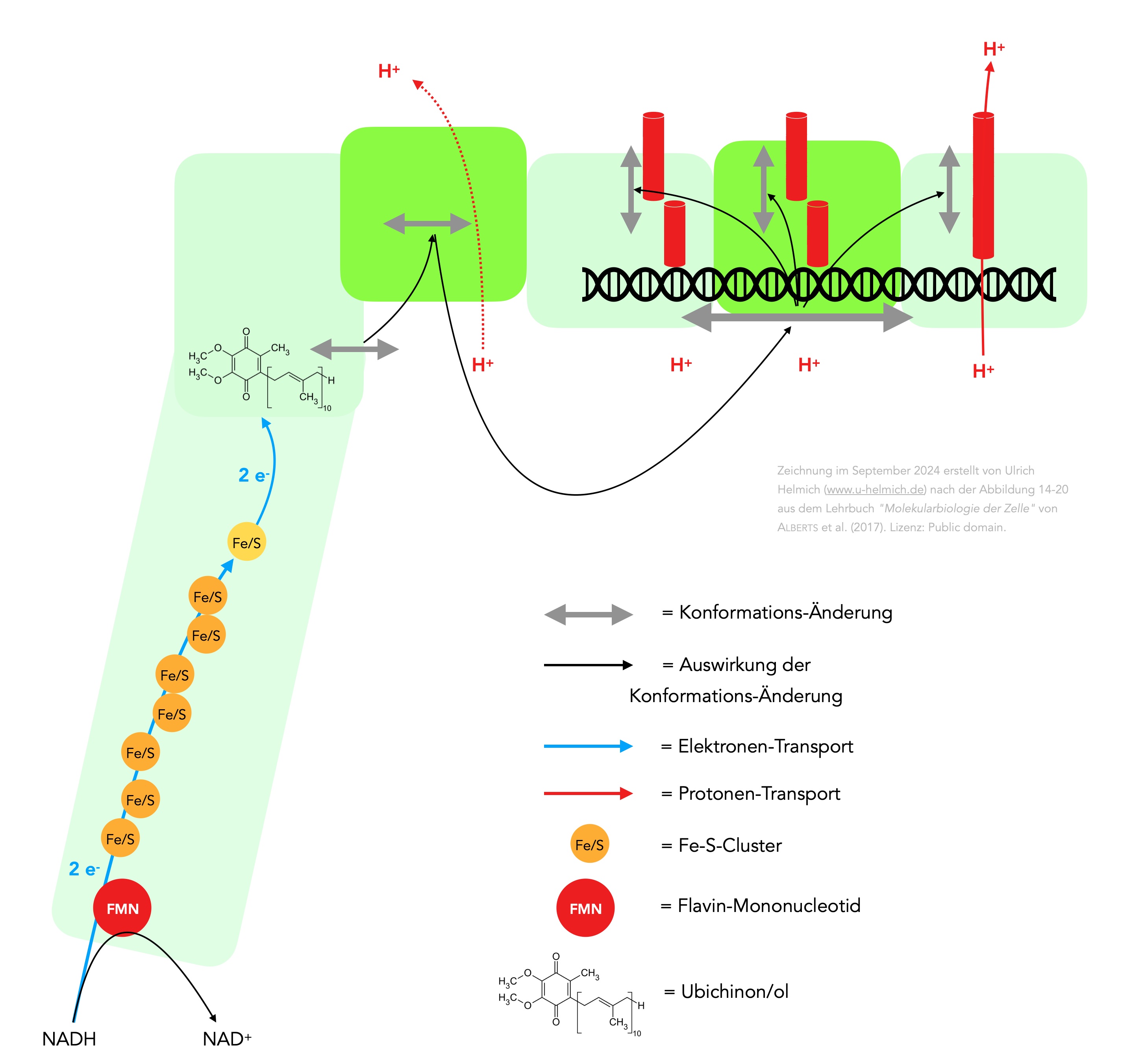 Ubichinon hat mit +0,10 V ein positiveres Redoxpotenzial als NADHmit -0,32V, die Elektronen fließen also "bergab", ähnlich wie in einer Batterie, wenn sie vom Zink zum Kupfer fließen. Die in dieser Redoxpotenzial-Differenz gespeicherte Energie ermöglicht dann den aktiven Transport von vier Protonen quer über die innere Mitochondrienmembran in den Zwischenmembranraum. Der Transport dieser vier Protonen macht schon einmal 40% des gesamten Protonentransfers über diese Membran aus [4].