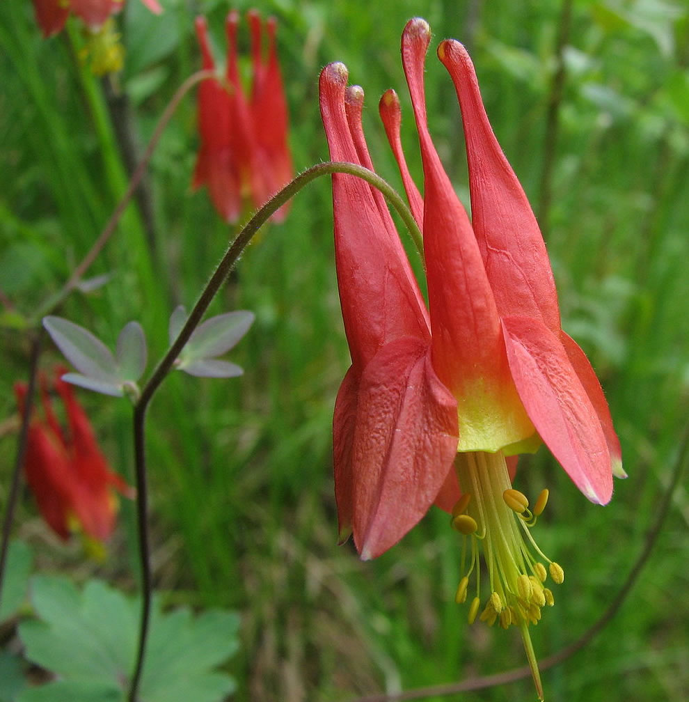 Die gespornten Nektarorgane von Aquilegia canadensis (Kanadische Akelei) dienen zugleich auch der optischen Anlockung der Bestäuber
