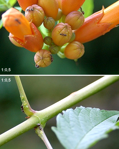 Dieser extraflorale Nektar enthält nicht nur Zucker, sondern auch einen hohen Anteil von Proteinen und Aminosäuren.