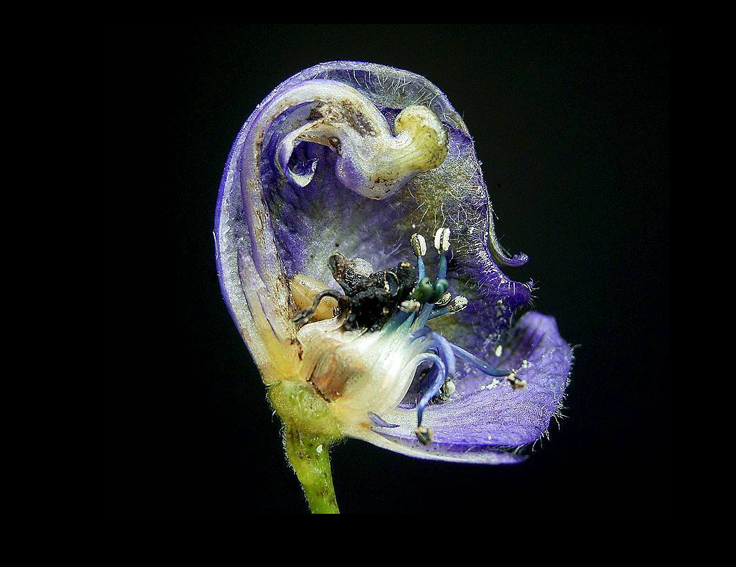 Schnitt durch eine reale Blüte des Blauen Eisenhuts (Aconitum napellus). Die Nektarblätter sind im großen helmförmigen Kelchblatt untergebracht. Zugänglich ist der Nektar nur für langrüsselige Hummelarten