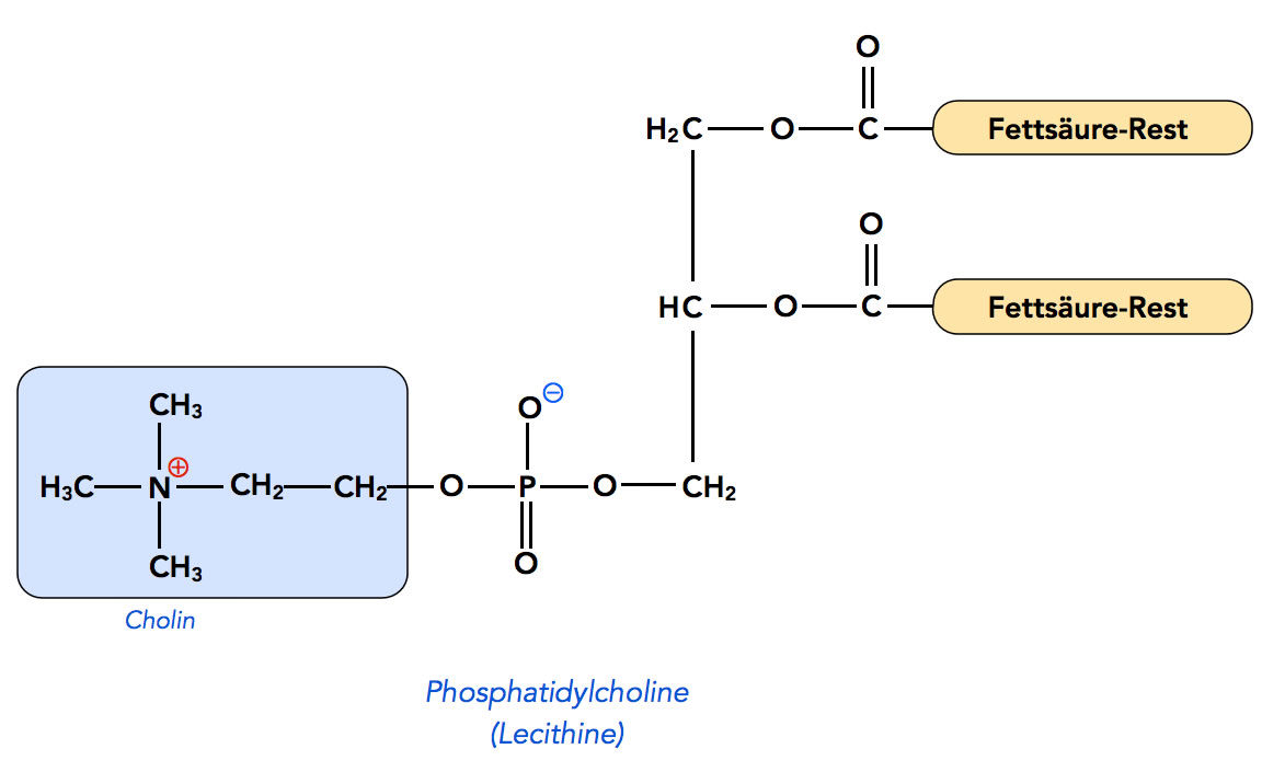 Die Phosphatidylcholine sind eine wichtige Klasse der Phosphoglyceride, die zu den Membranlipiden gehören. Die Kopfgruppe besteht aus Cholin, einem Alkohol mit einem quartären N-Atom, an dem drei Methylgruppen sitzen.