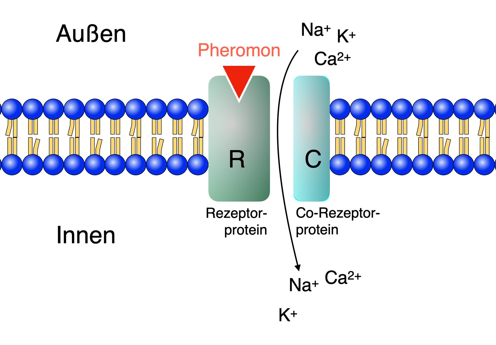 Im Gegensatz zum Transduktionsprozess bei Säugetieren, der über G-Proteine und Adenylatcyclasen abläuft, ist der Transduktionsprozess bei Insekten recht einfach: Die Rezeptorproteine (R) bilden zusammen mit einem sogenannten Co-Rezeptorprotein (C) einen Ionenkanal, der Na+, Ca2+ und K+-Ionen passieren lässt.