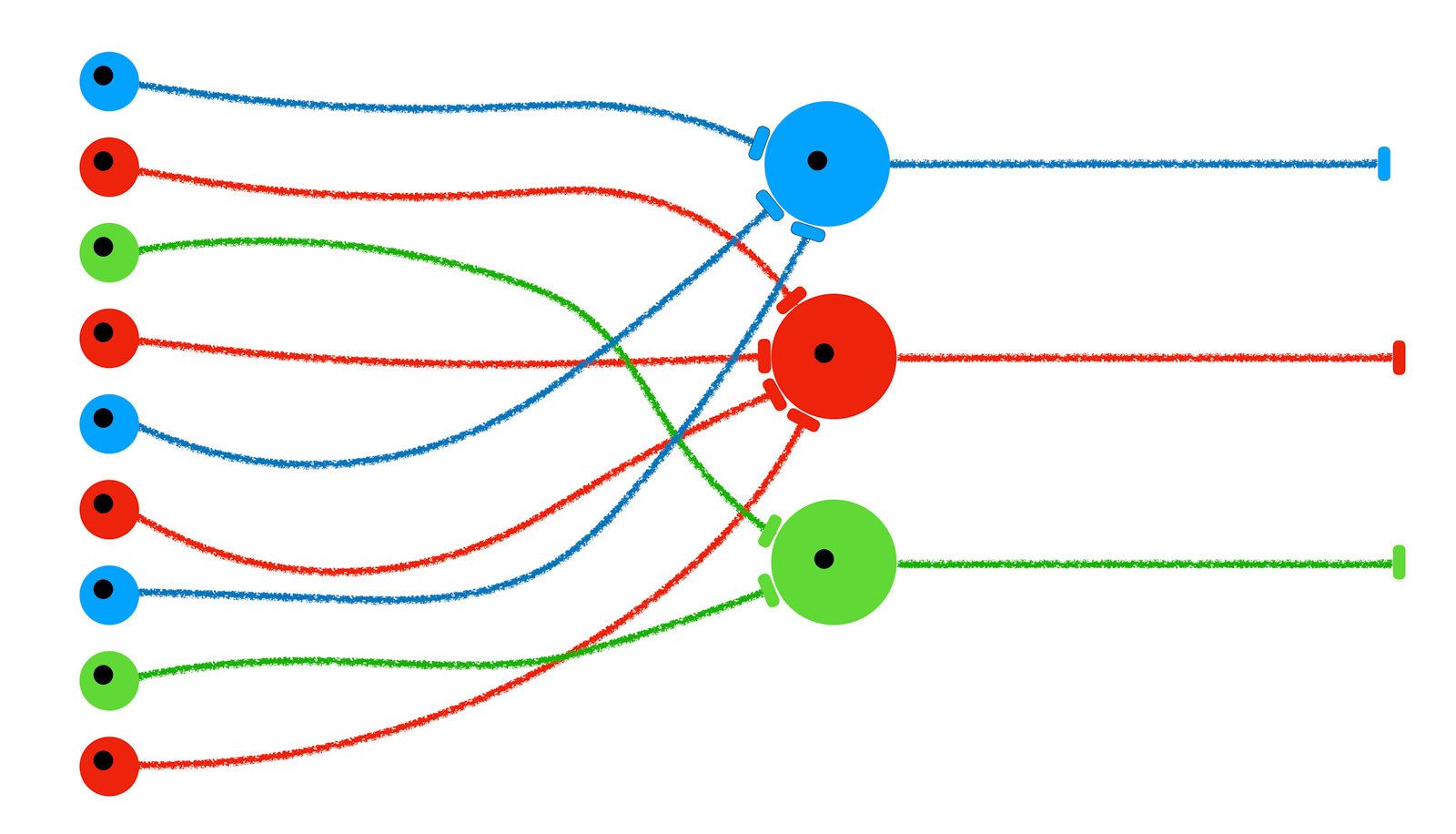 Jeder Riechsinneszellen-Typ projiziert auf einen Glomerulus. In unserem Schema gibt es daher drei Glomerluli, einen blau gekennzeichnet für die "blauen" Riechsinneszellen, einen rot gekennzeichnet für die "roten" und einen grün markierten für die "grünen" Riechsinneszellen.