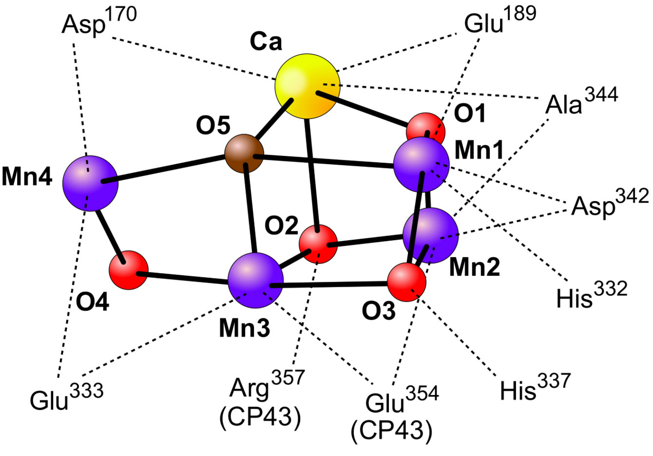 Eine zentrale Rolle bei der Photolyse des Wassers spielt der Komplex aus vier Mangan-Atomen, fünf Sauerstoff-Atomen und einem Calcium-Atom [5].