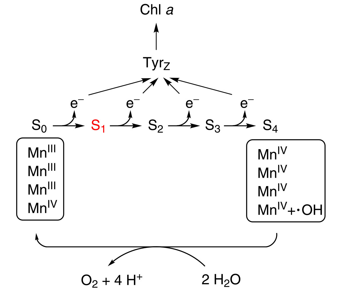Auf diesem Bild aus der englischsprachigen Wikipedia ("Oxygen-evolving complex") sieht man die Vorgänge bei der Photolyse des Wassers in Einzelschritte zerlegt. Der Mangan-Komplex enthält im Stadium 4 (S4) vier Mn4+-Ionen und ein Hydroxyl-Radikal *OH. Dieser Komplex nimmt nun die vier Elektronen auf. Drei der Mn4+-Ionen werden jetzt zu Mn3+-Ionen reduziert, und das *OH-Radikal nimmt ein Elektron auf und wird zum OH--Ion, was im Bild aber nicht zu sehen ist.