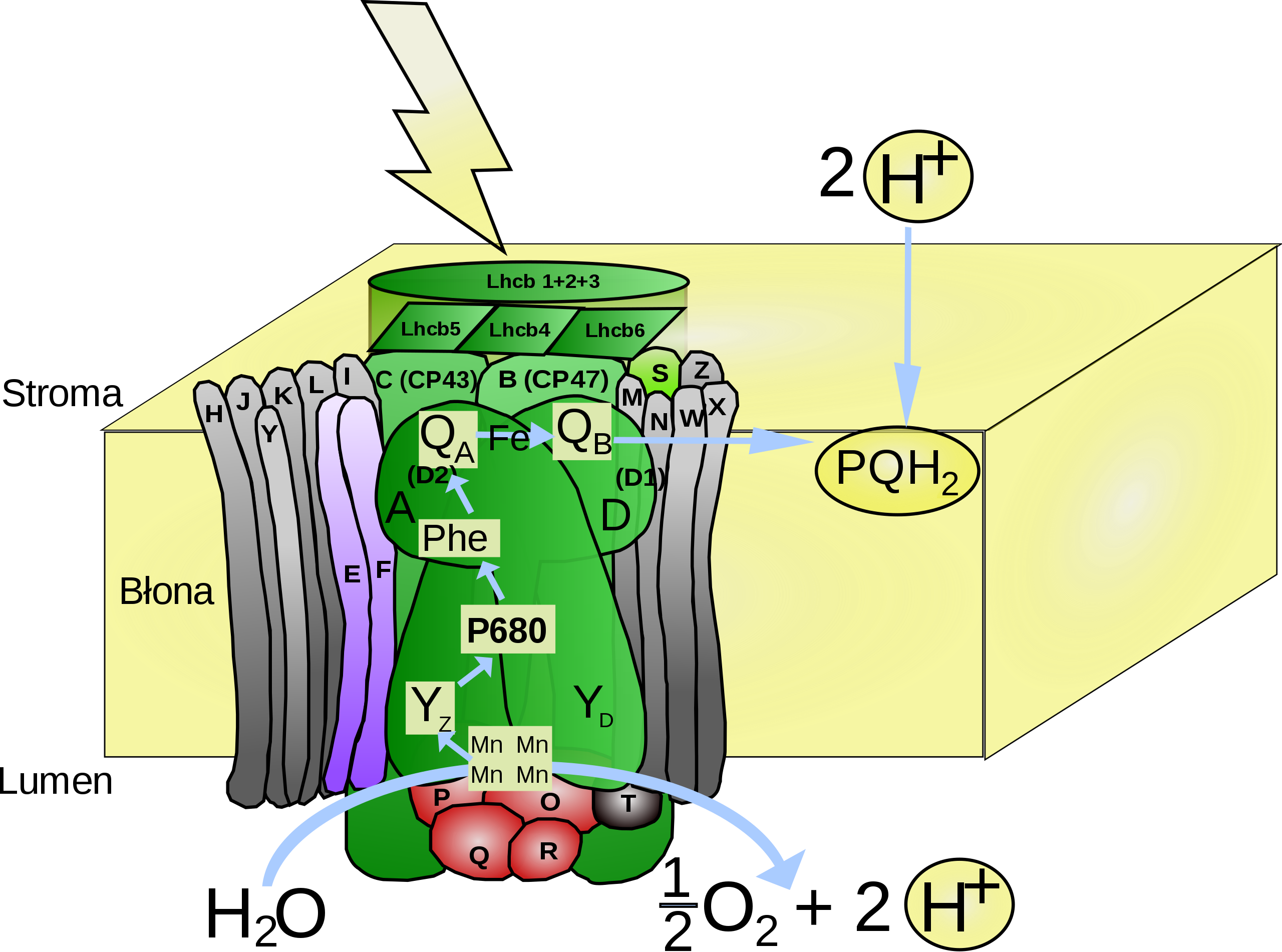 Das Reaktionszentrum überträgt die Energie in Form von zwei Elektronen auf ein Pheophytin- und ein Plastochinon-Molekül (Phe bzw. QA). Von dort werden die Elektronen dann weiter auf ein zweites Plastochinon-Molekül (QB) übertragen, welches daraufhin durch die beiden Elektronen und durch Aufnahme von zwei Protonen zu QBH2 (Plastochinol) reduziert wird (in der Abbildung als PQH2 bezeichnet).