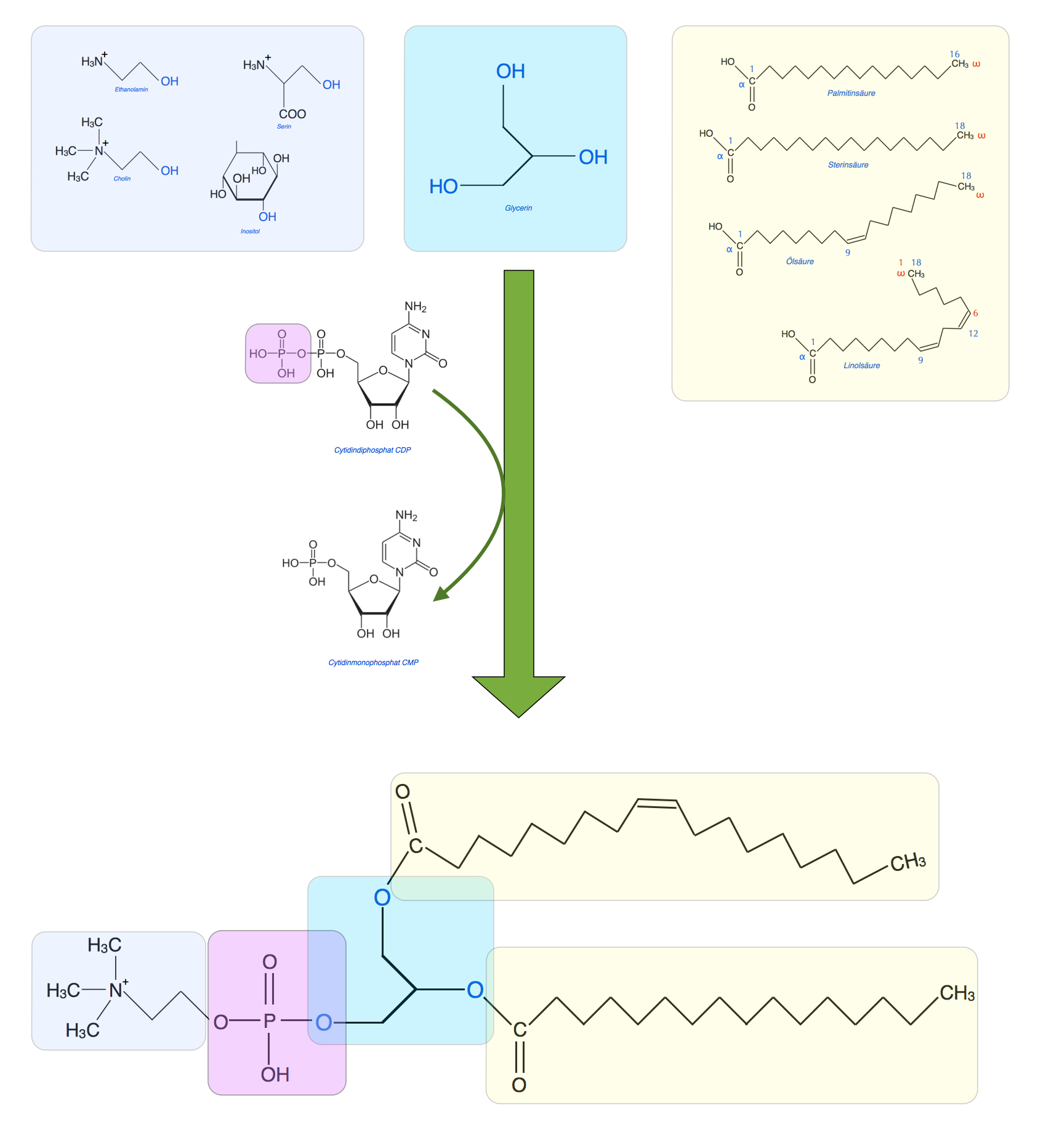 In Wirklichkeit ist die Biosynthese von Glycero-Phospholipiden noch etwas komplizierter. Wer sich dafür interessiert, schaut sich mal die Wikipedia-Seite "CDP-Cholin" an.