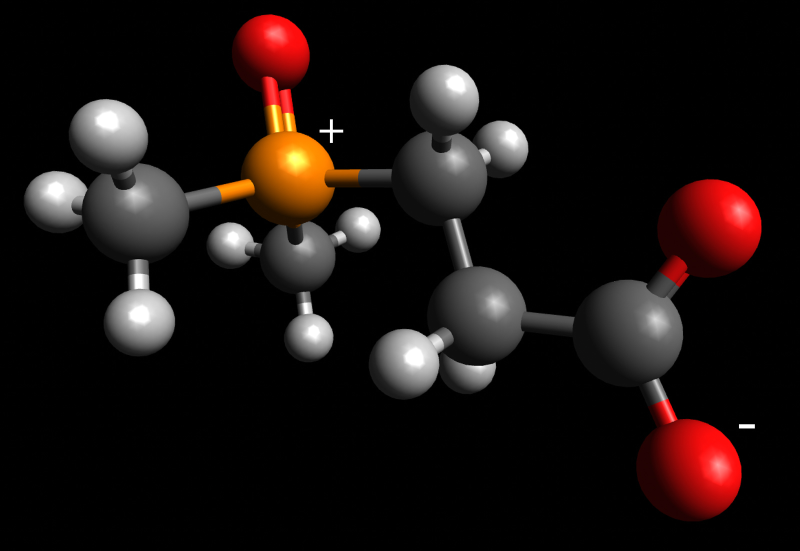 Bei diesem Molekül handelt es sich um eine Propansäure CH3-CH2-COOH, die mit einem DMS-Molekül verbunden ist: (CH3)2-S+-CH3-CH2-COO-. Das Schwefel-Atom ist positiv geladen, das O-Atom der Carboxygruppe negativ. Es handelt sich also um ein Zwitterion.