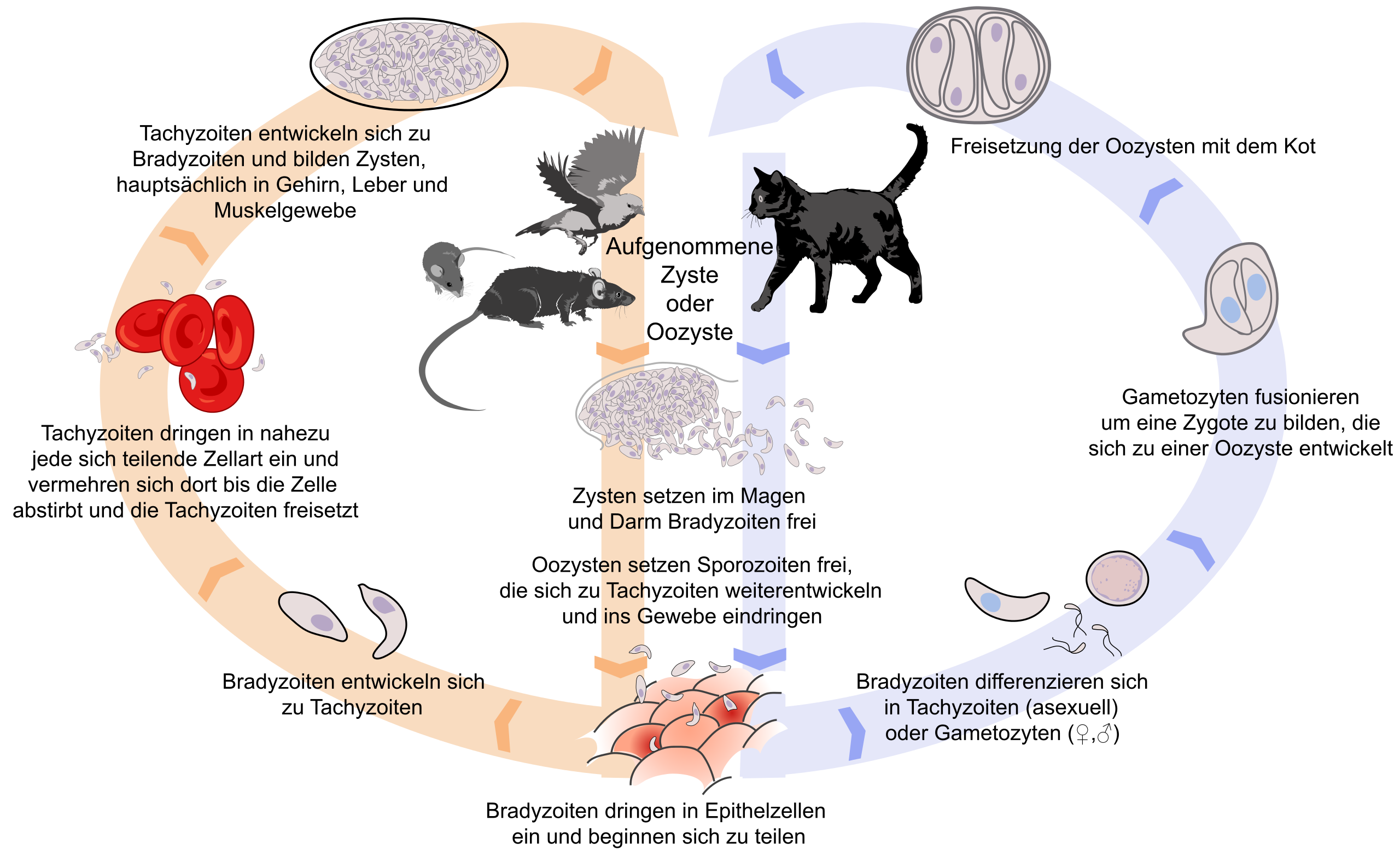 Wenn dann eine Maus, ein anderer kleiner Säuger oder ein Vogel diese Oocysten mit dem Kot einer Katze aufnimmt, beginnt der zweite Abschnitt des Entwicklungszyklus.