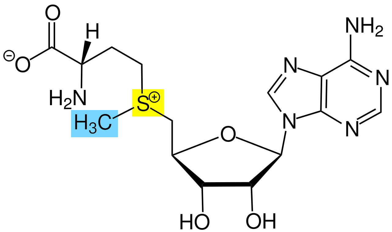 Dieses Bild zeigt das S-Adenosyl-Methionin-Molekül. Dieses Coenzym überträgt eine Methyl-Gruppe (blau hervorgehoben). Interessant ist, dass die zu übertragene Gruppe ähnlich wie beim Coenzym A an ein Schwefel-Atom gebunden ist.