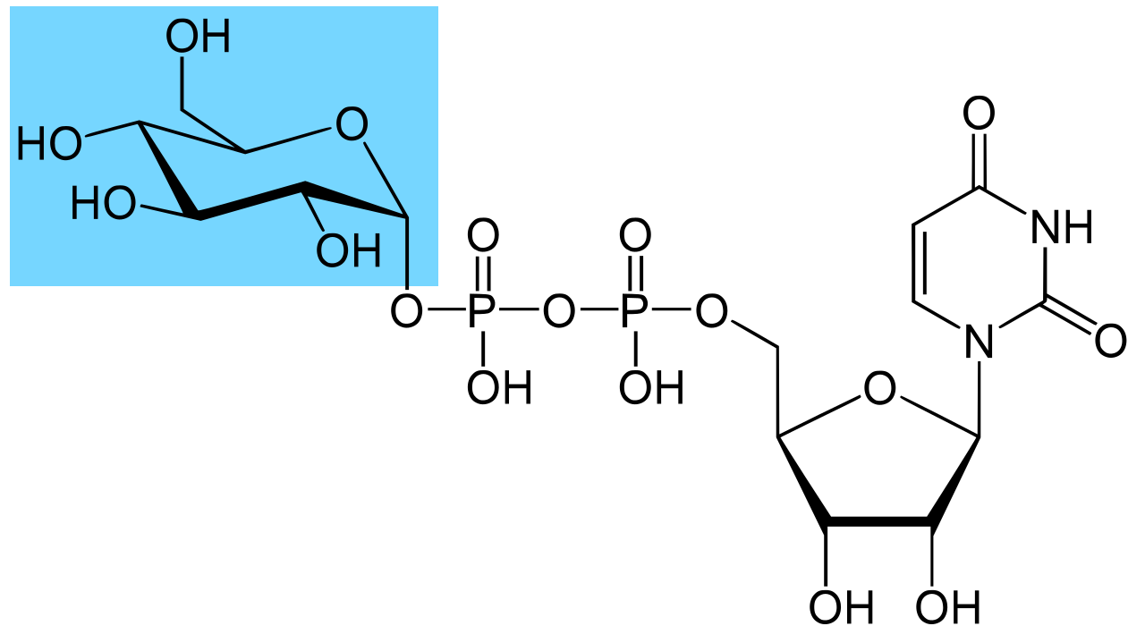 Dieses Bild zeigt ein UDP-Glucose-Molekül. Die zu übertragene Glucose ist blau gekennzeichnet. UDP-Glucose wird auch als aktivierte Glucose bezeichnet.